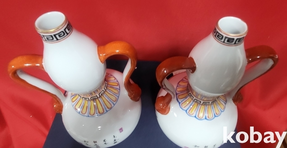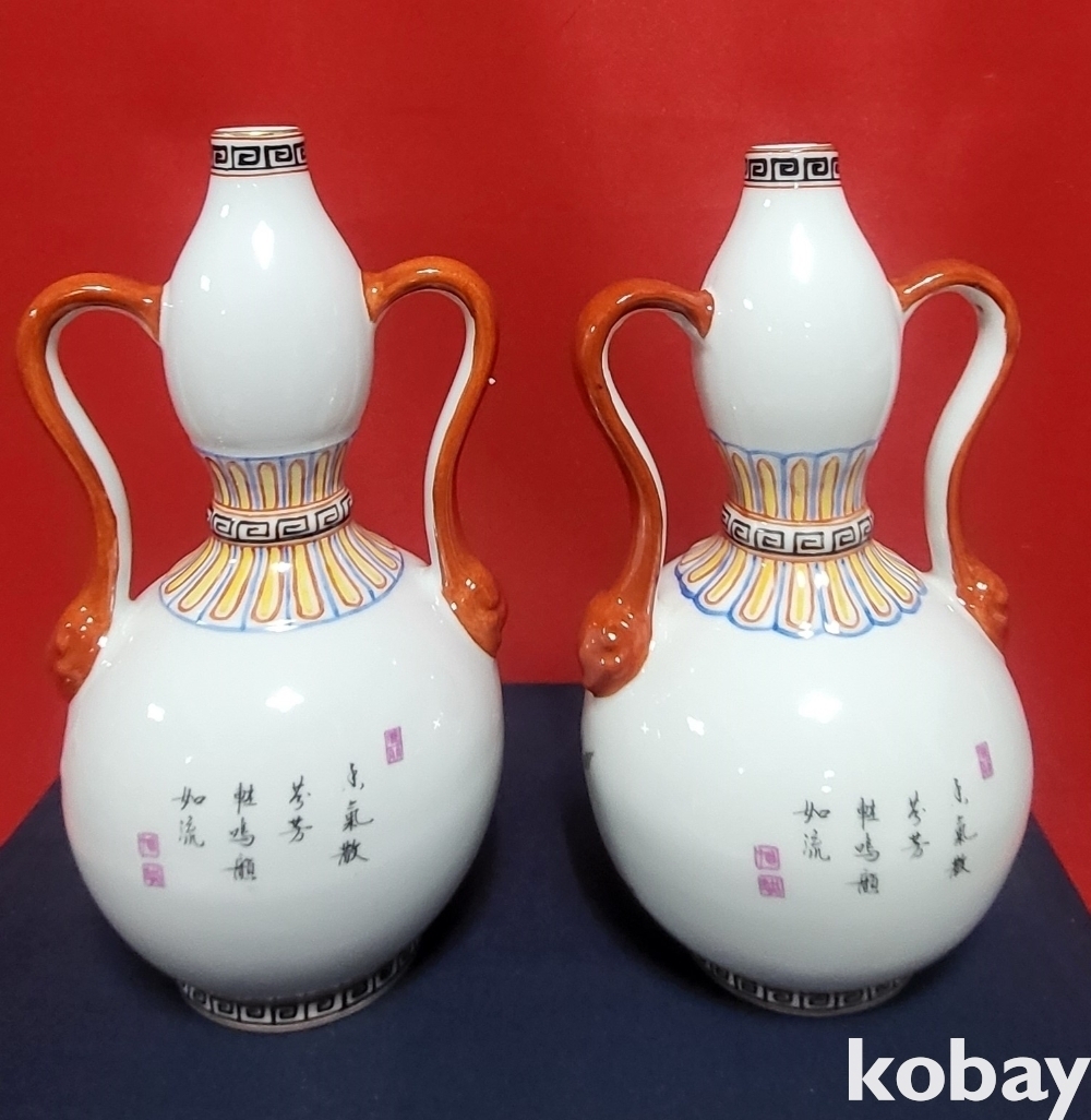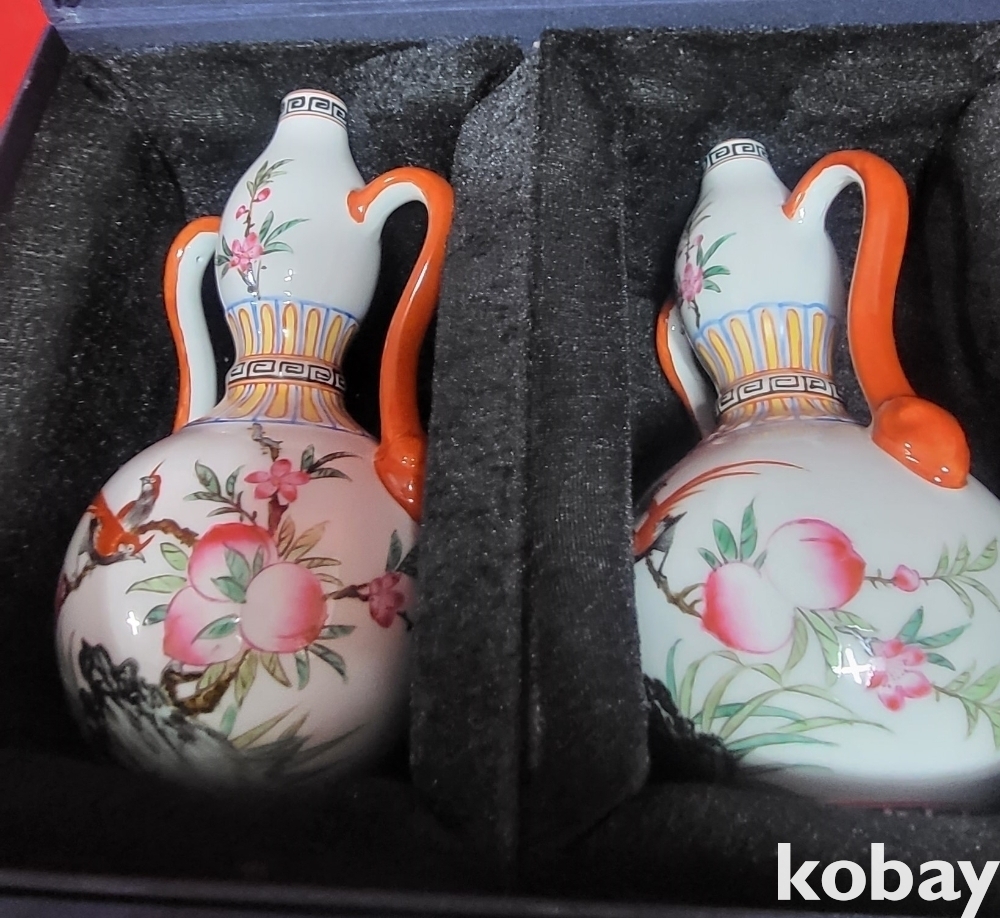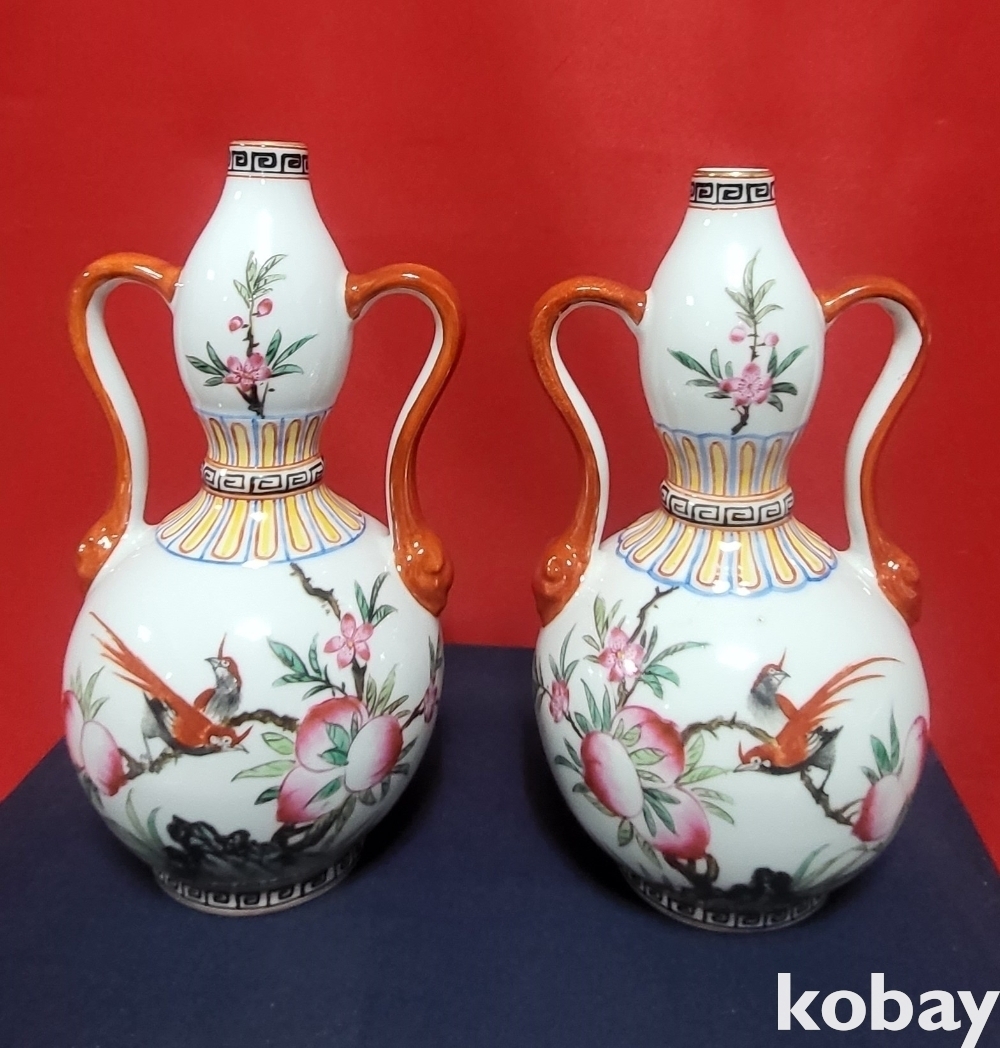 청대 옹정어제 ( 雍正御製) 관지 복숭아 꾀꼬리문양 양이(兩耳) 일대(두개)병입니다,