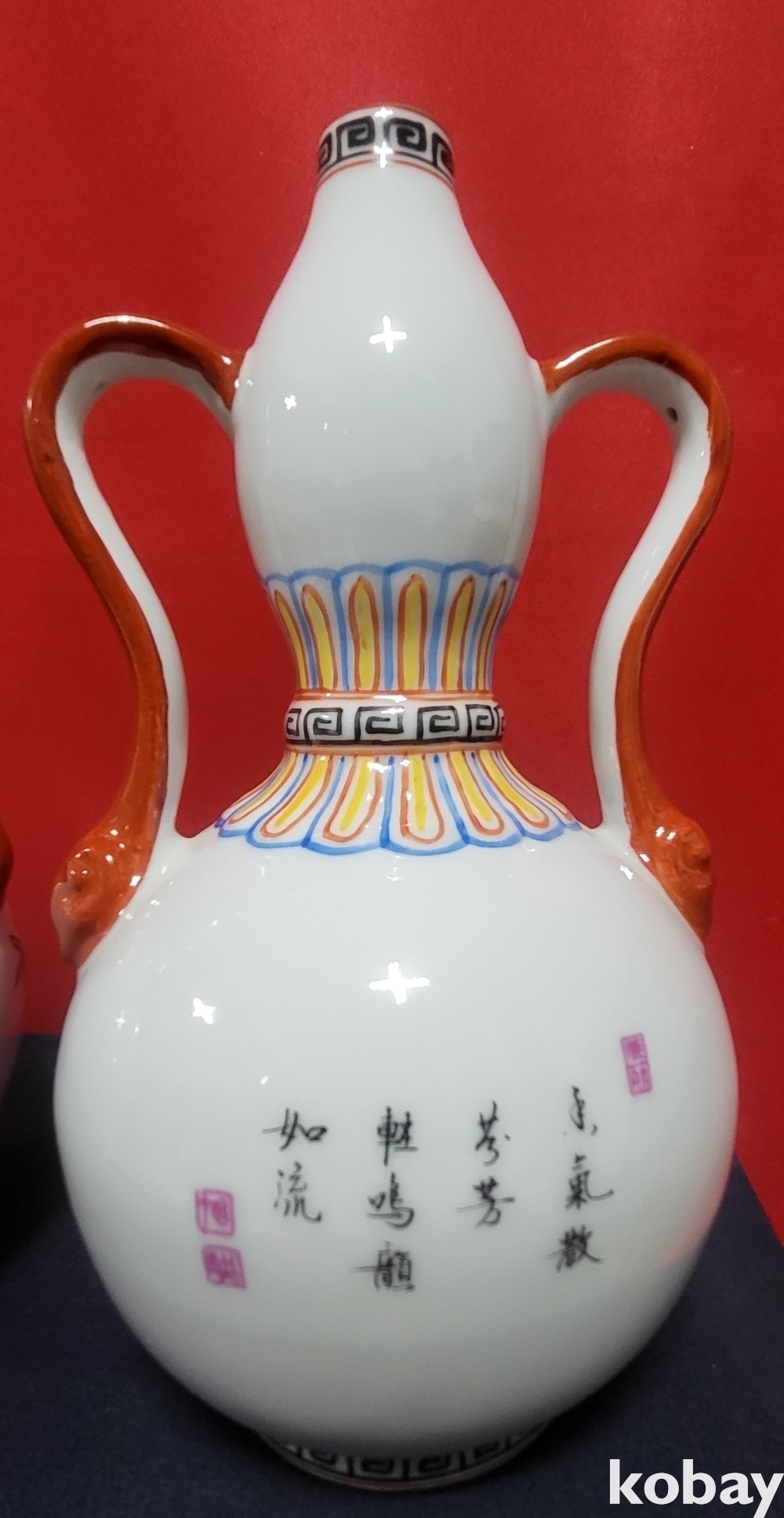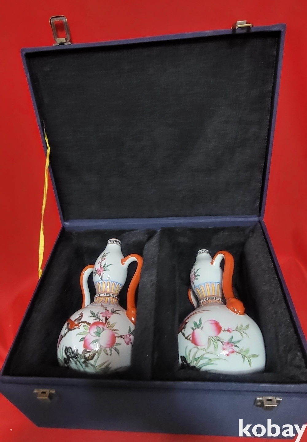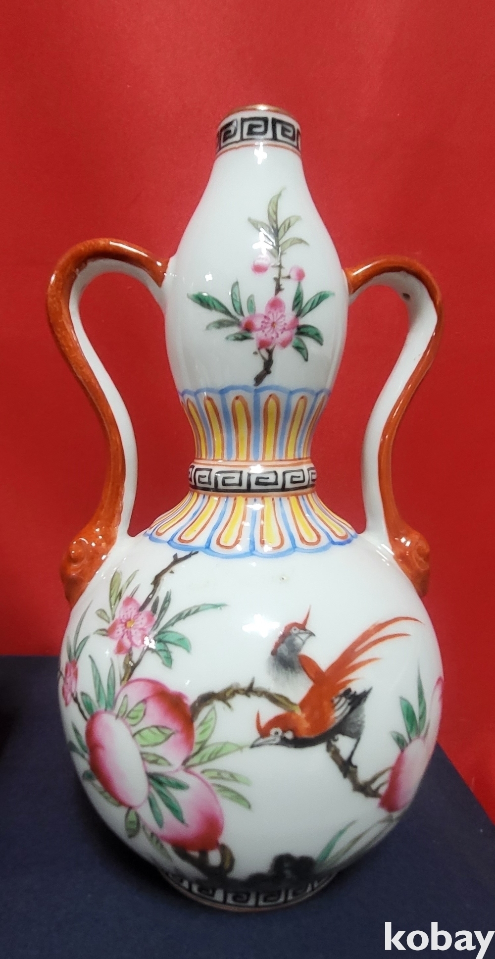 청대 옹정어제 ( 雍正御製) 관지 복숭아 꾀꼬리문양 양이(兩耳) 일대(두개)병입니다,