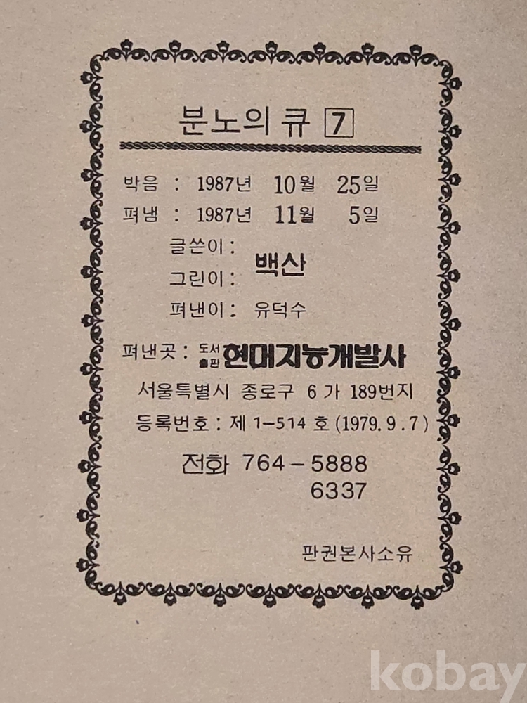 80년대 만화 == 1987년 발행 == 백산 글.그림 / 분노의 큐 == 8권 완질