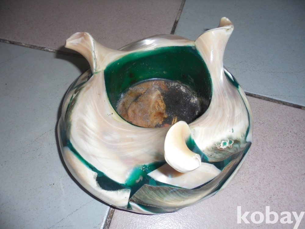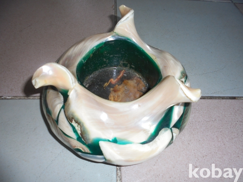 여러종류의 조개류을 붙여서 작품을 만든것으로 무거워 안정되고 다용도사용도되고 악세사리도 되는 조개류로만든 재털이겸 먹물통
