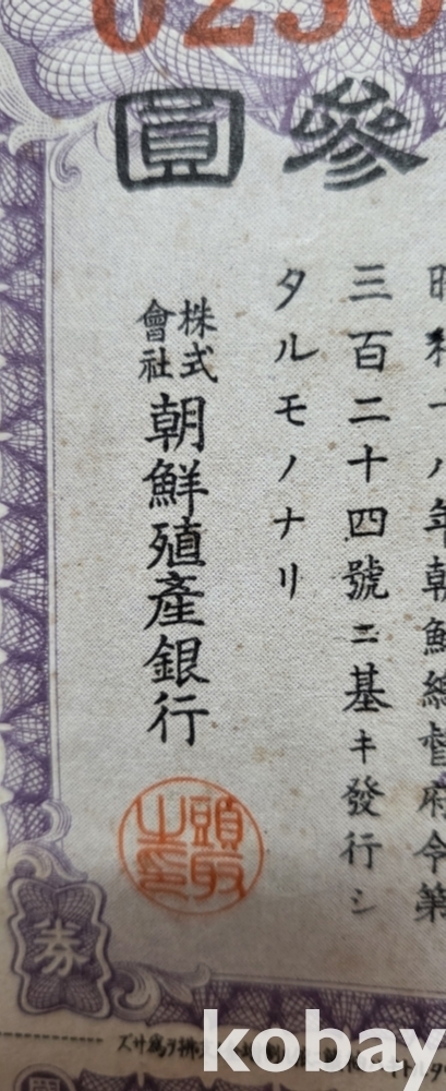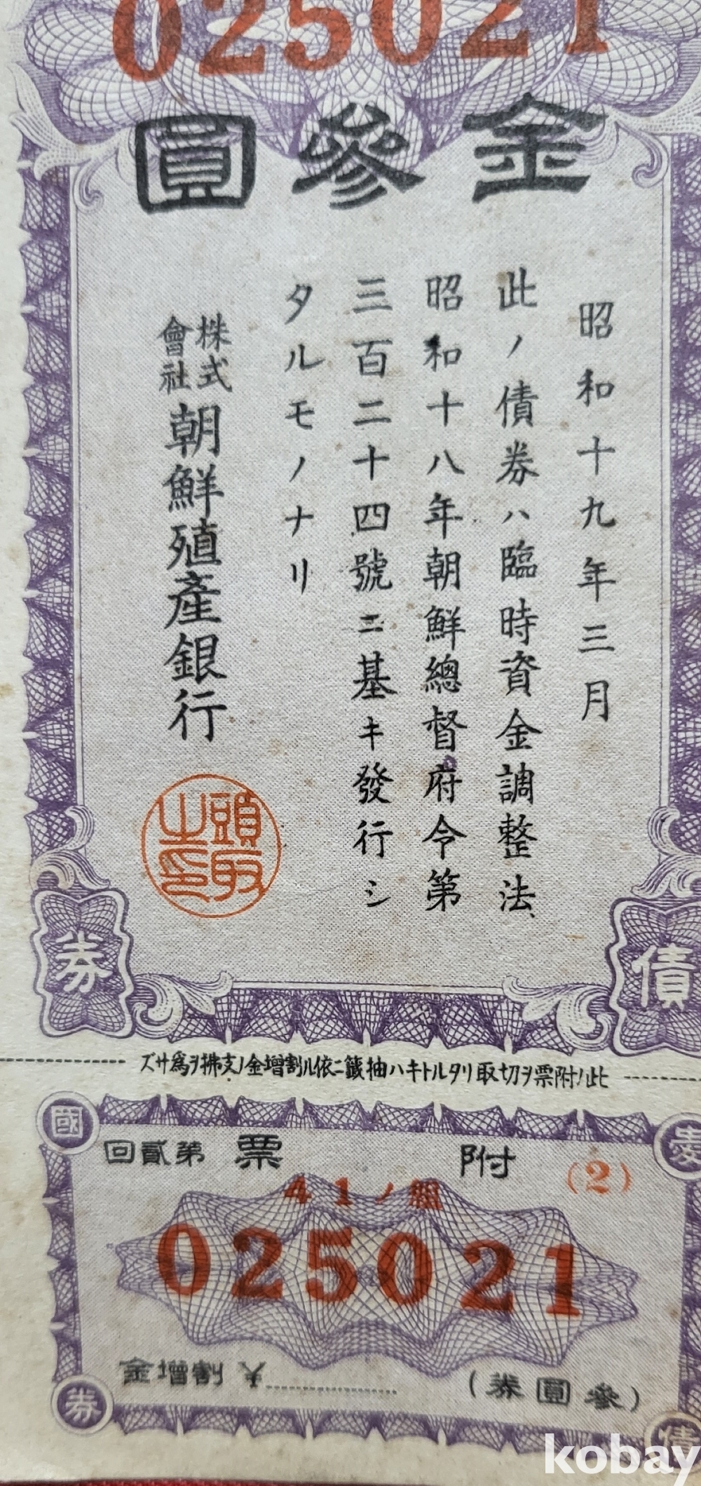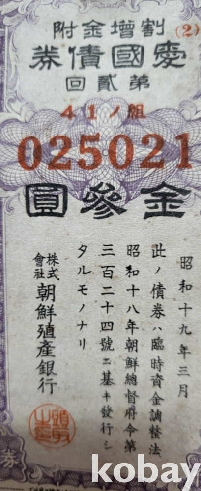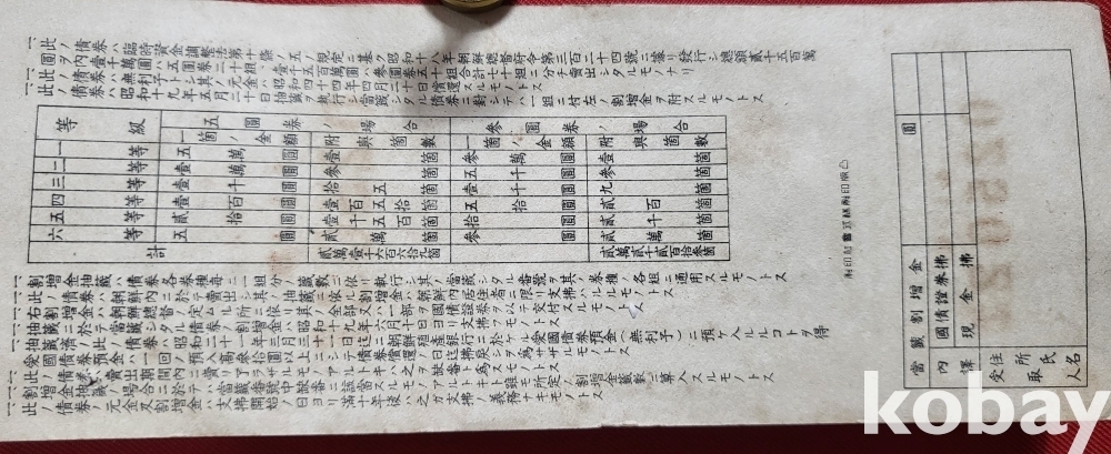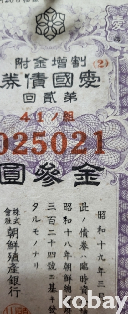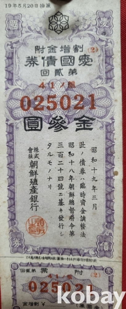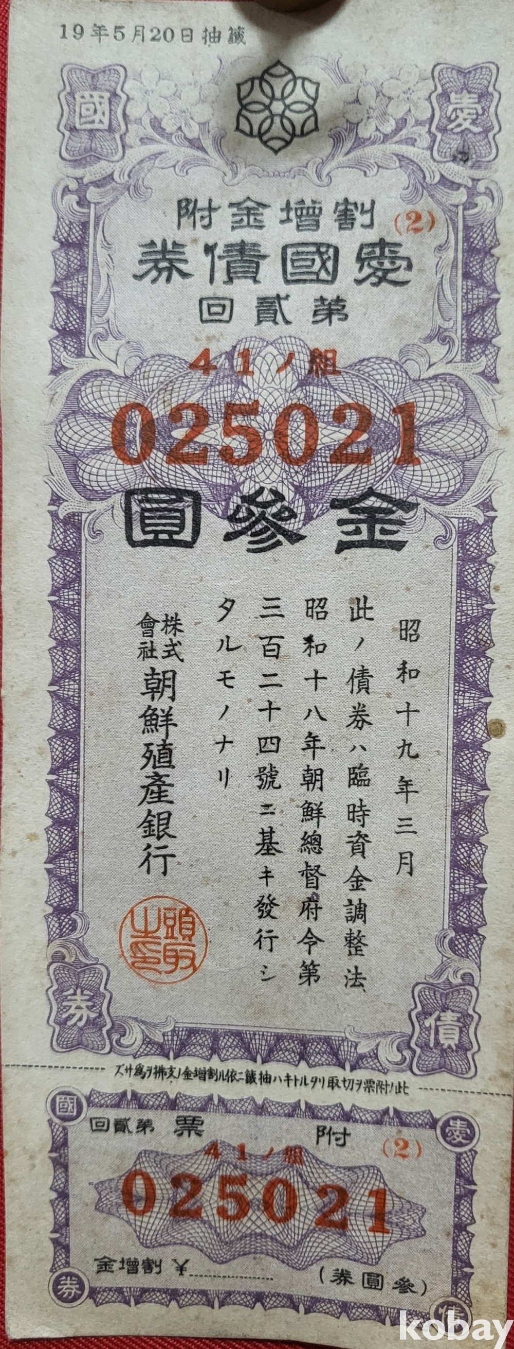 하나우측번 ///// 주식회사 조선 직산은행 소하19년(1943년) 발행된 할증금부(割增金附)입니다,