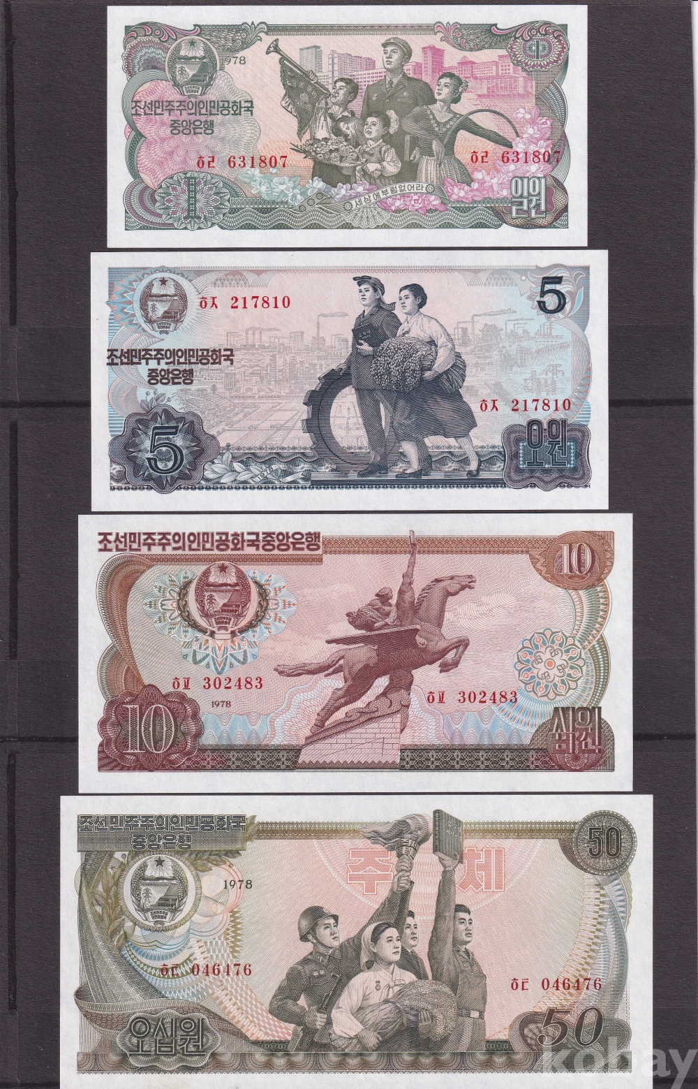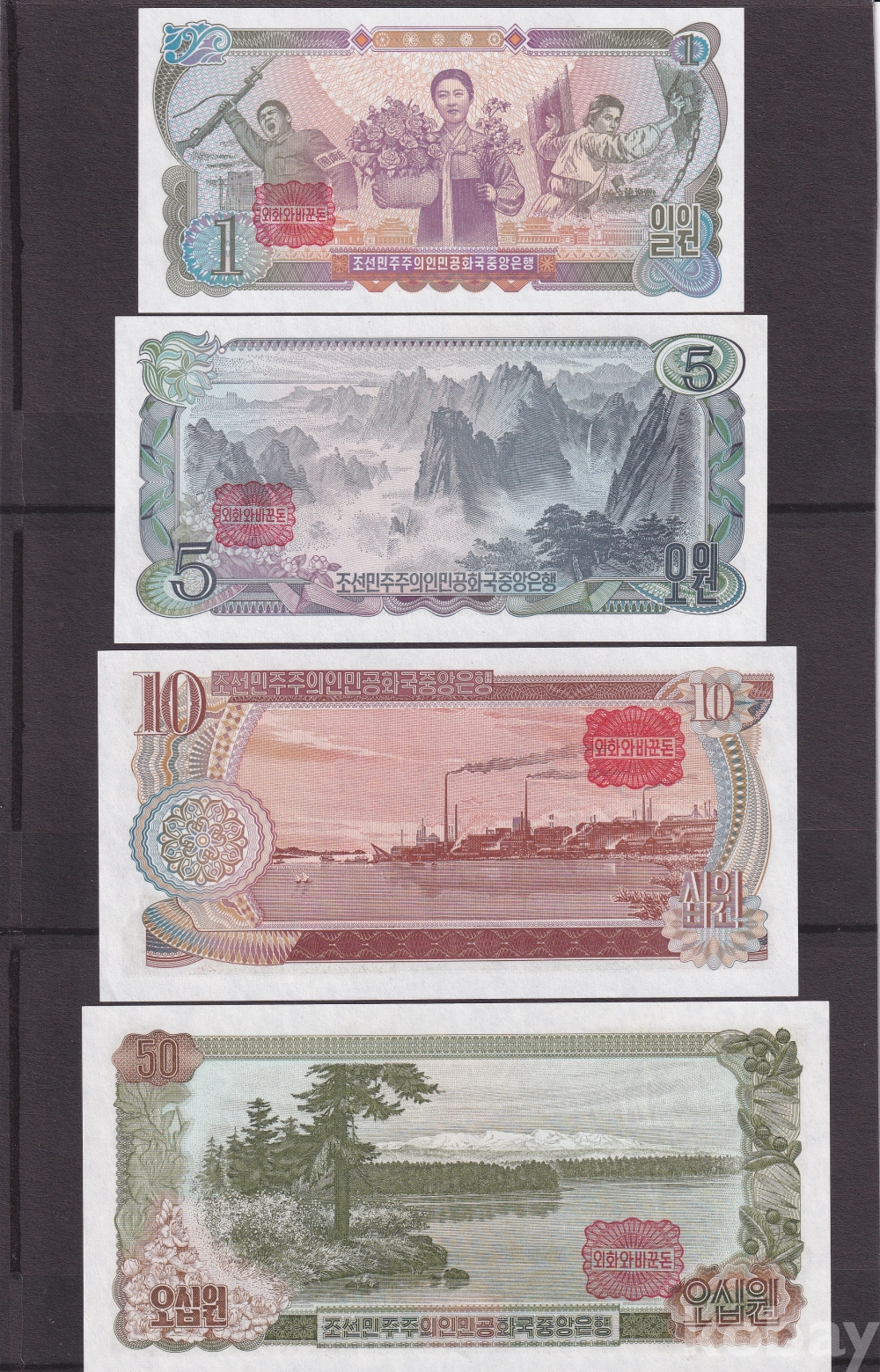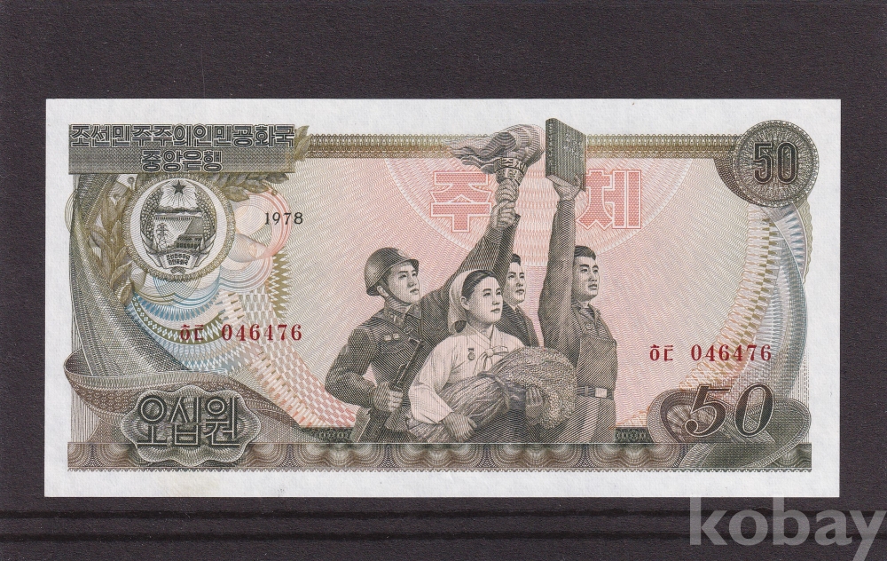 - 북한에서 1978년 발행된 1원/ 5원/10원/50원 지폐 4종에 외화와 바꾼돈/액면금액을 지폐에 가쇄를 하여 외화와 바꾼 돈표로 발행하였습니다.
