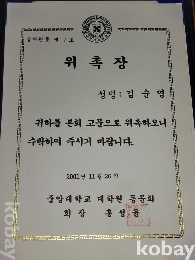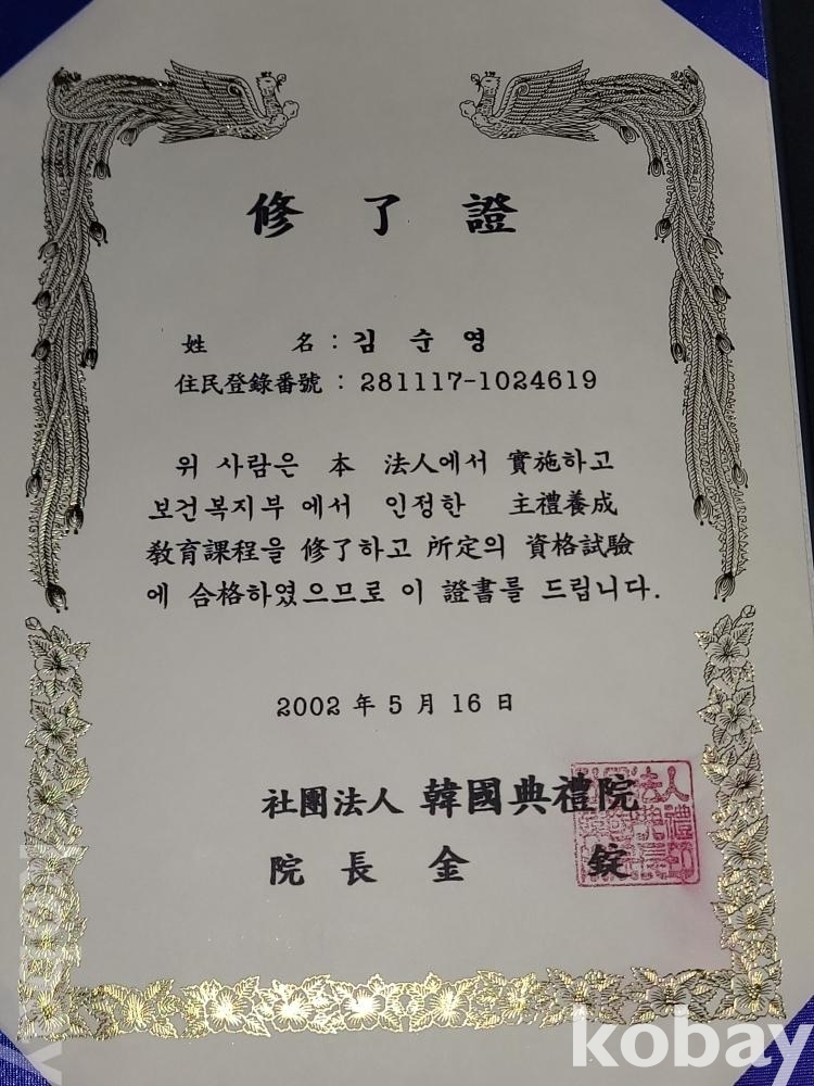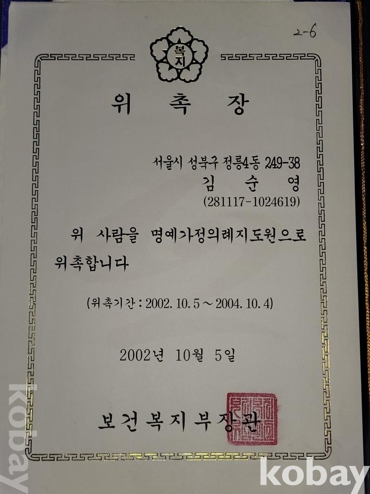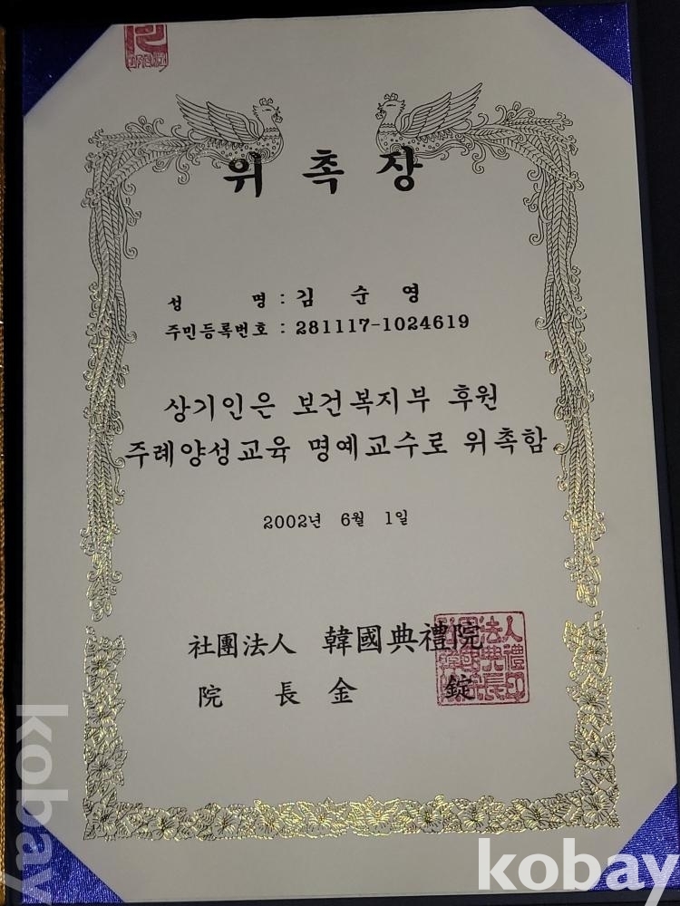 2001년 중앙대학교 대학원 동문회 고문 위촉장, 2002년 보건복지부 관련 수료증, 2002년 보건복지부장관 명예가정의례지도원 위촉장