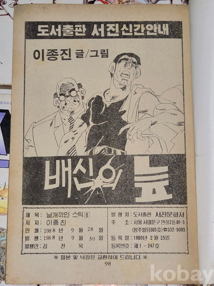 80년대 만화 == 1988년 발행 == 이종진 글.그림 / 날개꺾인 스틱 == 8권 완질