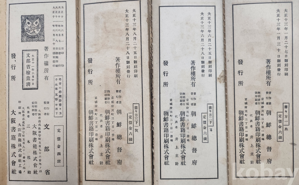일제감정기 보통학교 교과서 (서방수본) 입니다 1학년용에는 한글 큰글씨로 수록되어 있습니다 2.3 5 학년용은 한문큰글씨로 되어 있습니다 총4책 입니다 상태 매우 양호합니다 사진 참조바랍니다