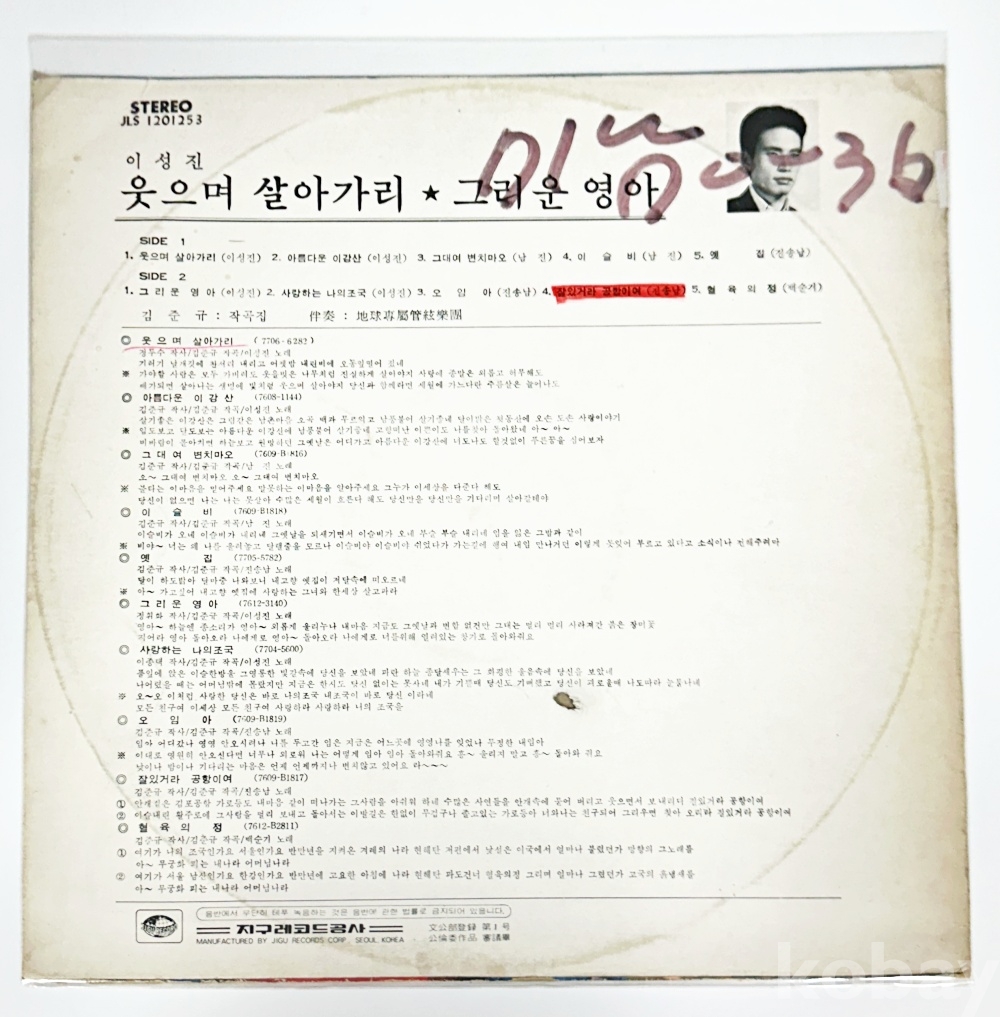 | 자켓상태 | EX : 약간의 마모, 모서리 찢김 존재 | 음반상태 | EX : 재생에 영향 없는 가벼운 기스 존재 | 발매정보 | 초반 | 가사지여부 | 무 |