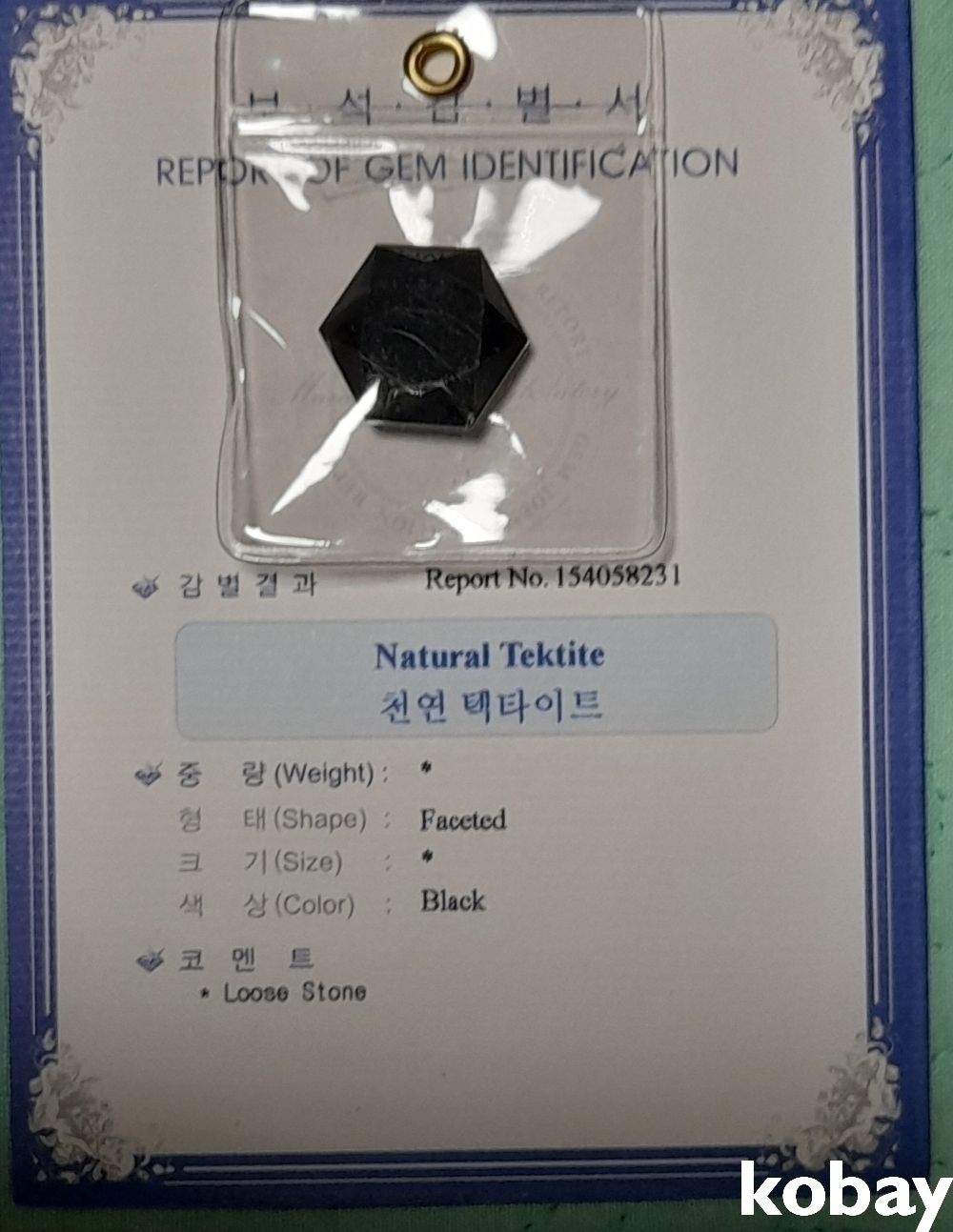 감정서가 있으며, 색상은 불랙, 천연 텍타이트입니다. (견본임)