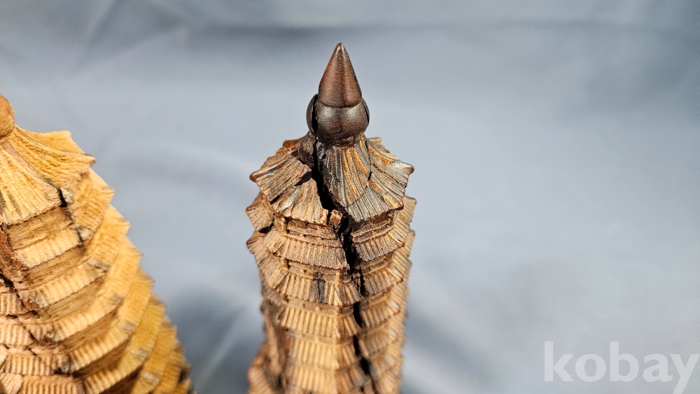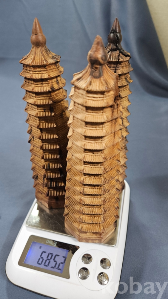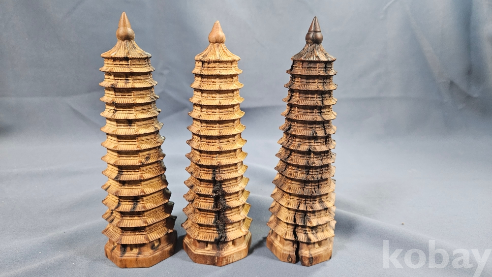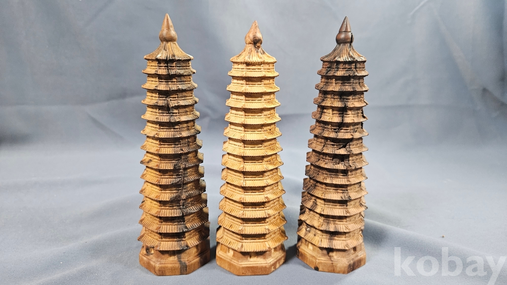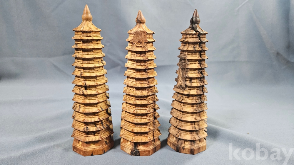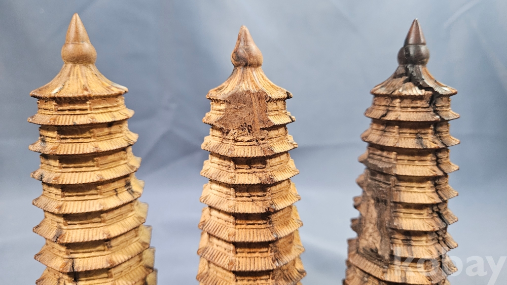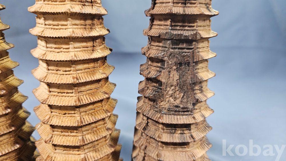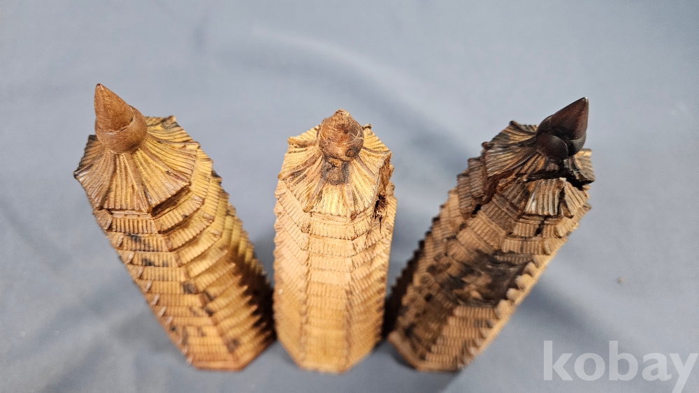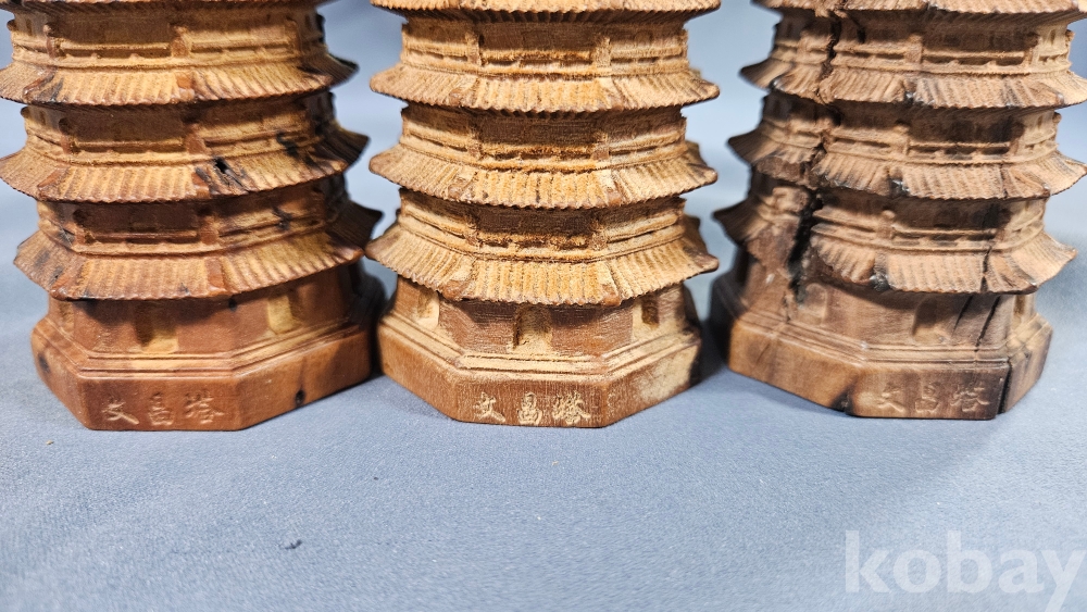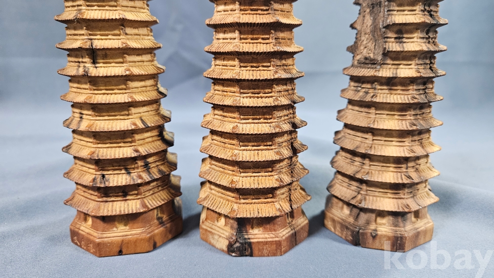 탑 형태로 만들어진 나무조각품 3점 일괄입니다.