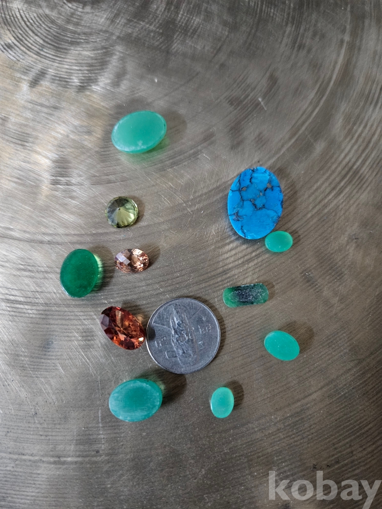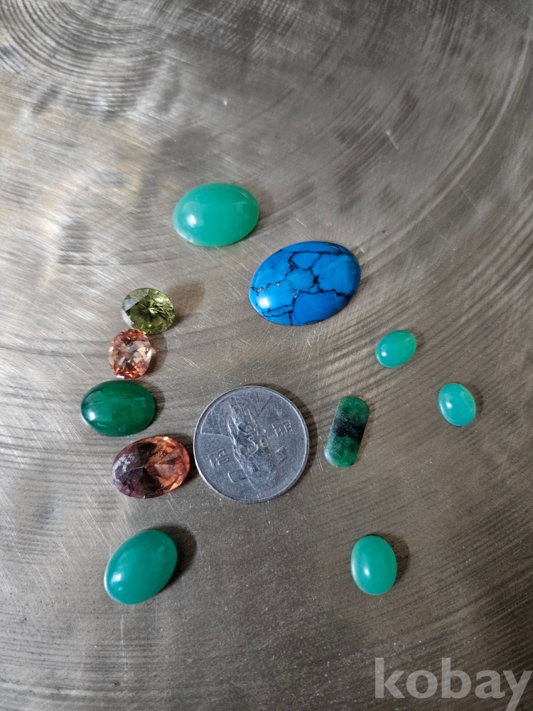 터키석(터콰이즈) 계열의 강렬한 블루부터 연한 녹색의 크롬석, 연두빛 스피넬 느낌의 합성석, 자수정 계열, 그리고 옥(비취) 혹은 유사 천연석까지 다양한 색감과 형태를 지닌 루스들이 포함되어 있습니다.