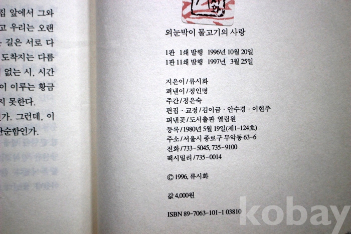 (류시화 시집) 외눈박이 물고기의 사랑 - 1997년. 도서출판 열림원 발행