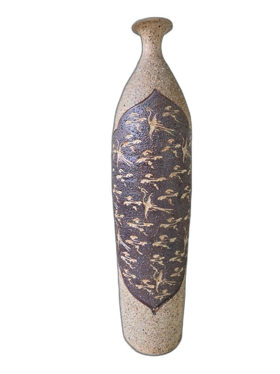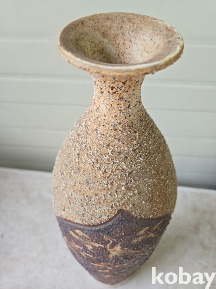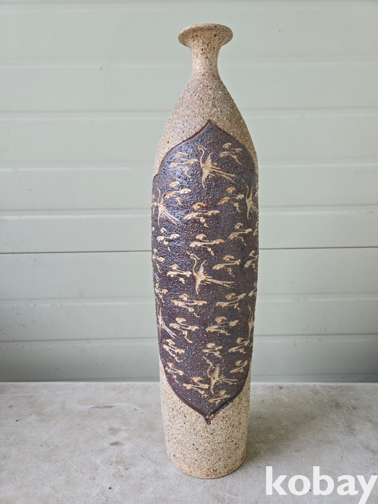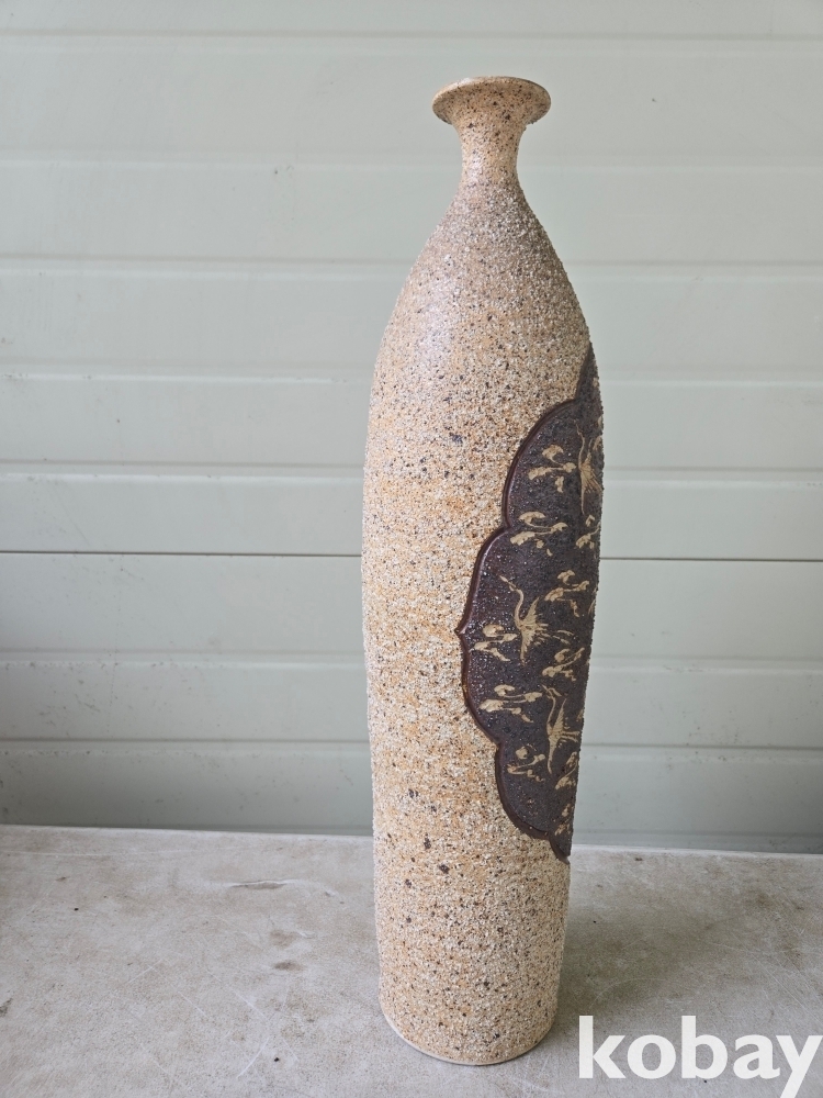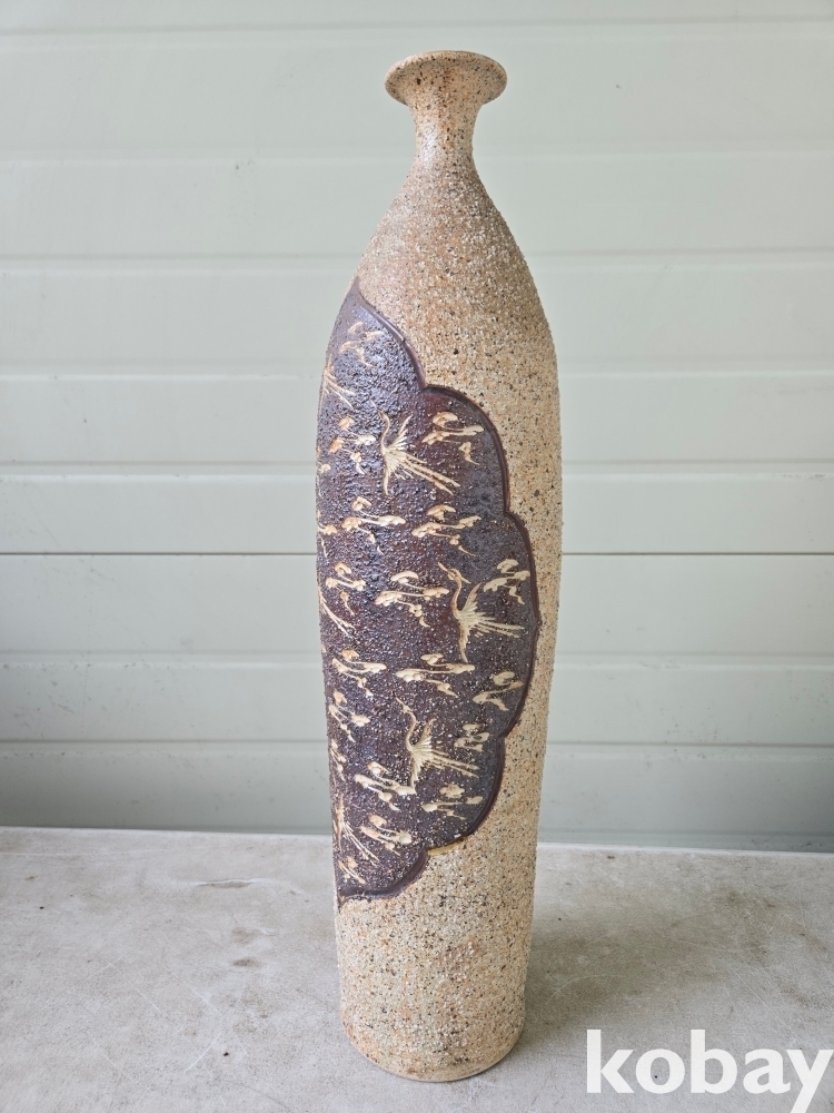 구름에 학 표현을 음각으로 표현한 목이 긴 도자기 입니다.