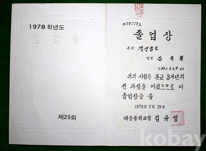 (상장 및 졸업장) 1979년 해동중학교의 졸업장