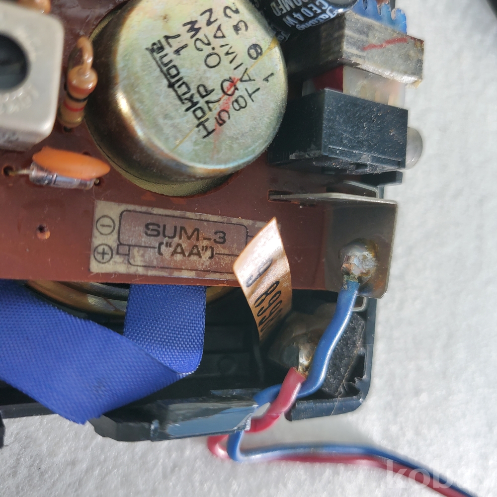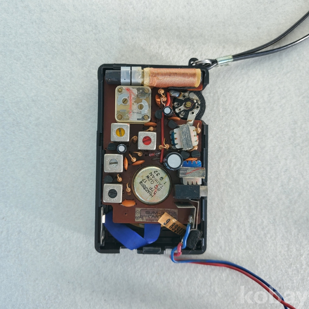 큰 배터리 연결선이 납땜 되어있습니다. 떼어내지 않았습니다. 그 시대 소형라디오에 큰 배터리를 연결하여 사용한 흔적입니다.