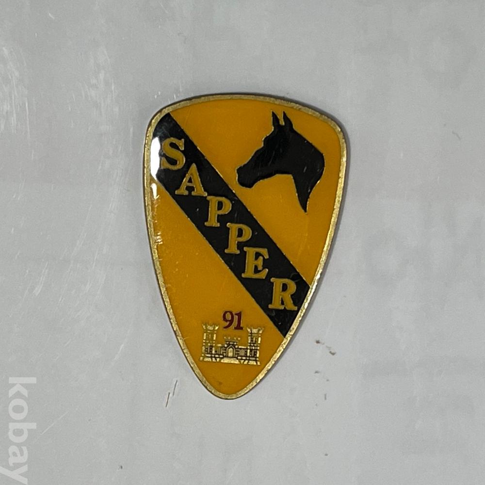 설명: 미 육군 제1기갑사단 산하 공병 부대를 상징하는 금속 핀(배지)입니다. 전투 공병을 뜻하는 'SAPPER' 문구가 적혀 있습니다.