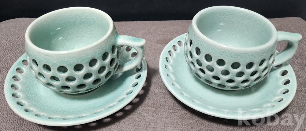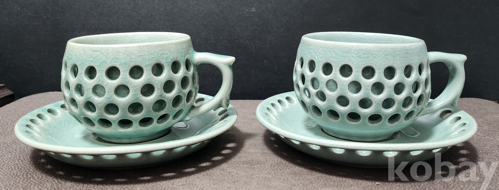청자투각찻잔 靑磁透刻茶盞  < 2점 세트 작품 >  (도예가 수결작품)