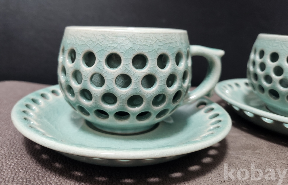 청자투각찻잔 靑磁透刻茶盞 < 2점 세트 작품 > (도예가 수결작품)