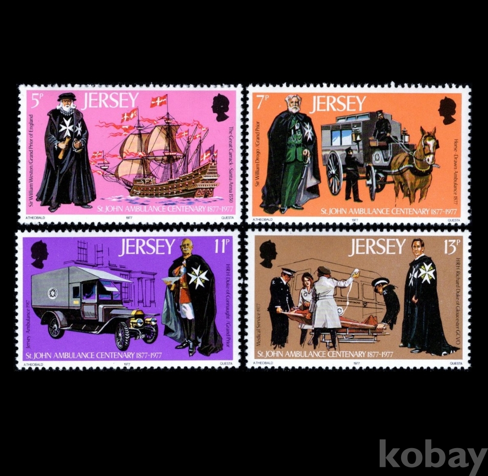 영국령 저지섬) 1977년 세인트 존 응급의학 학회 100주년(윌리엄 웨스턴 경과 산타 안나호 1530년, 윌리엄 드로고 경과 말이 끄는 구급차 1877년, 코노트 공작과 저지섬 구급차 1917년, 글로스터 공작 리처드와 구급대원들 1977년)