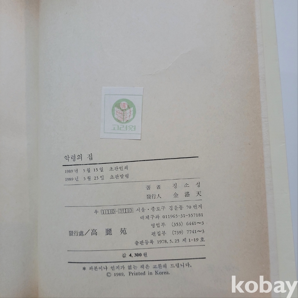 [희귀본] 악령의집(정소성) 고려원 1989년 초판본 ; 중급/서고T306