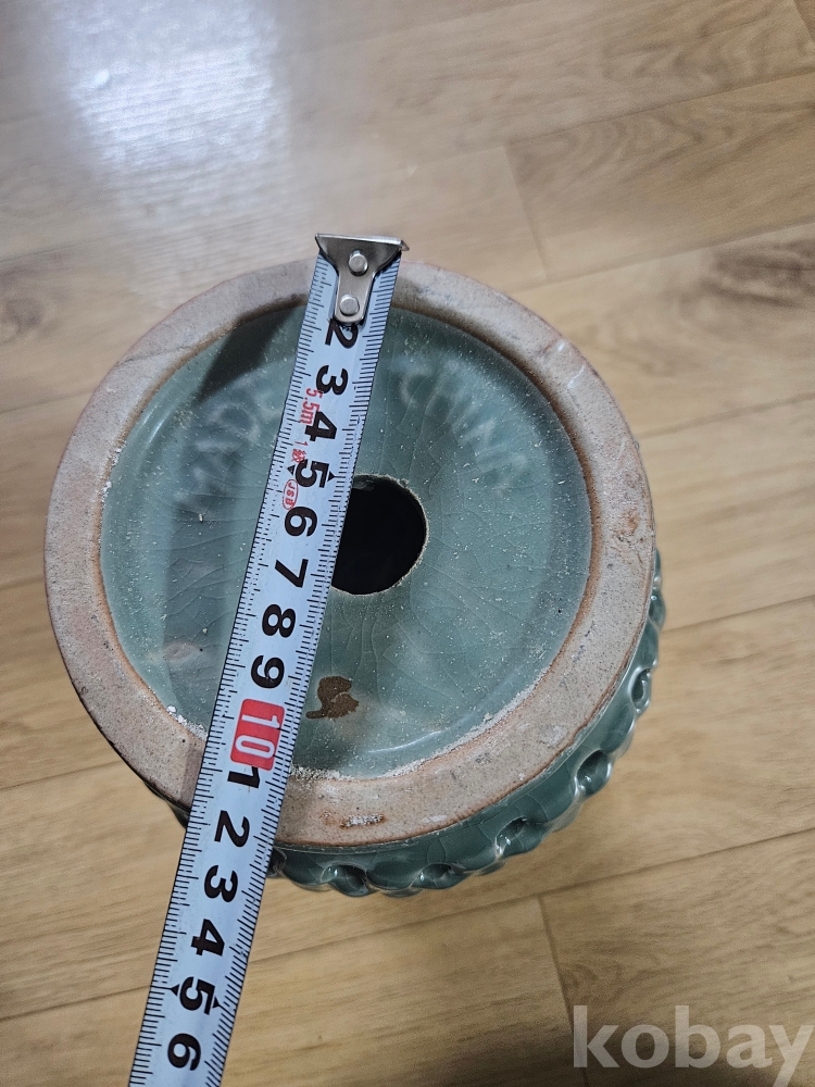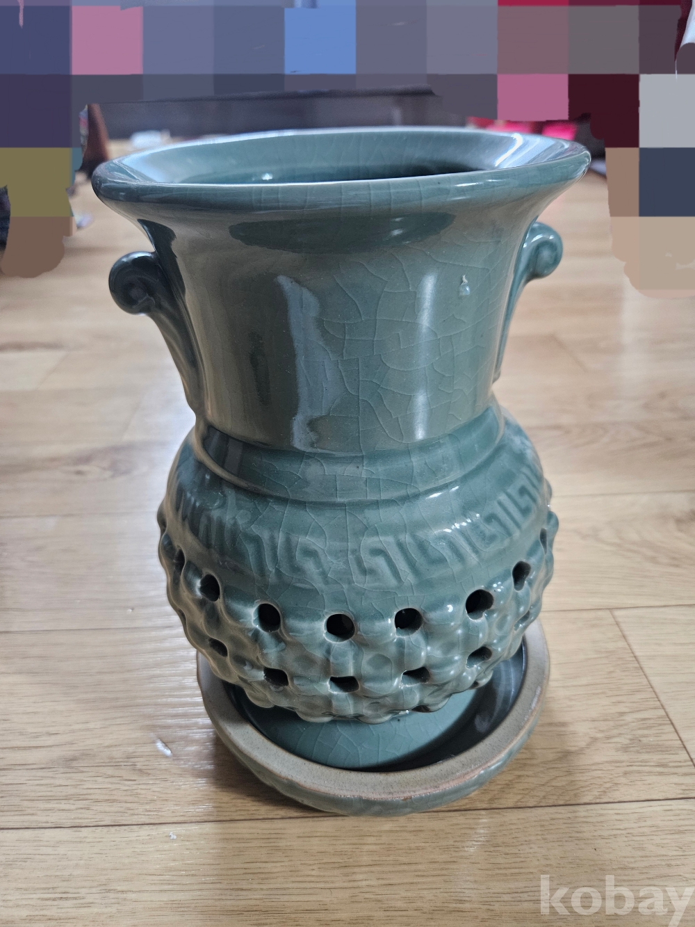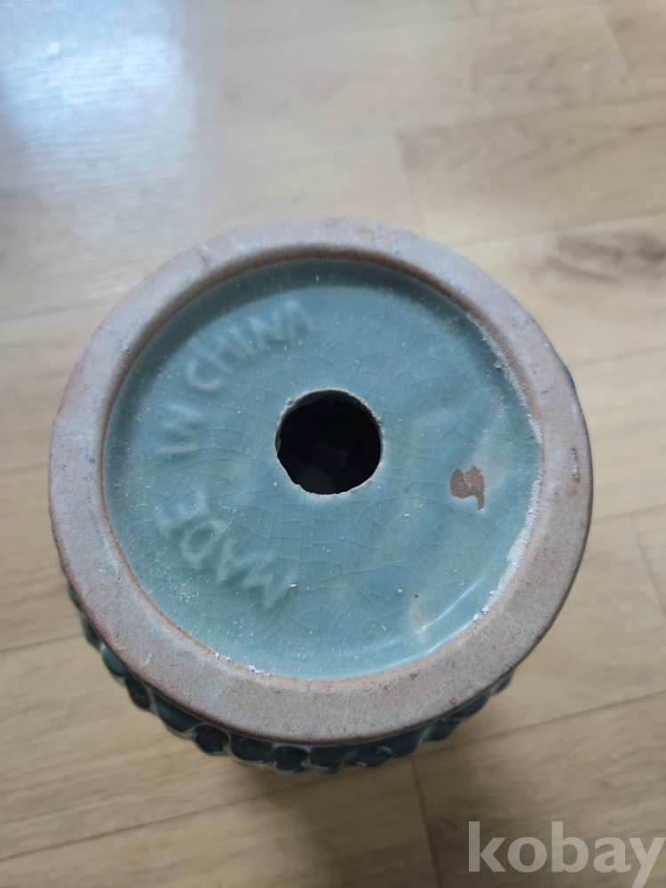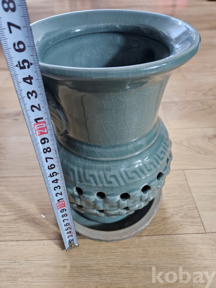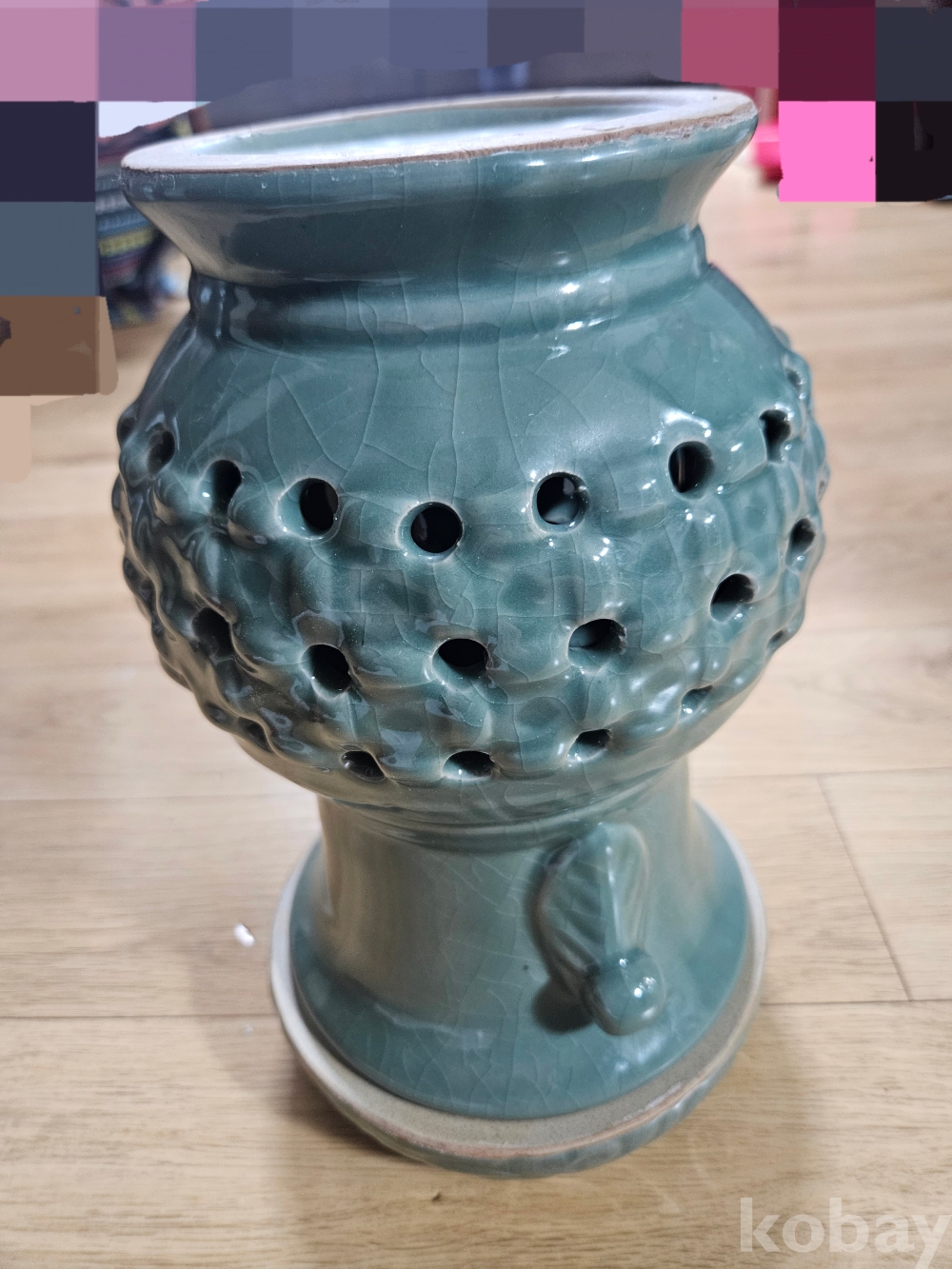 본 상품은 고풍스러운 청록색 유약과 독특한 질감, 그리고 전면에 뚫려 있는 구멍 장식이 인상적인 도자기 화병입니다.