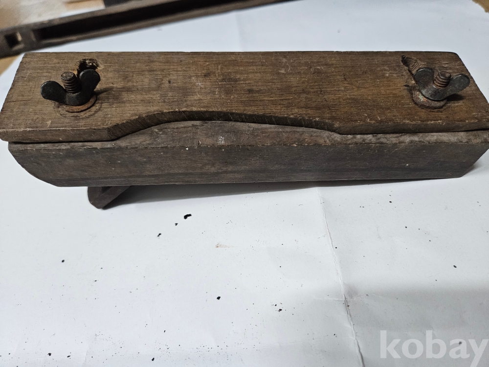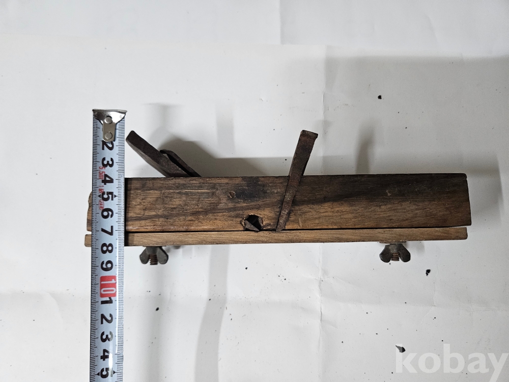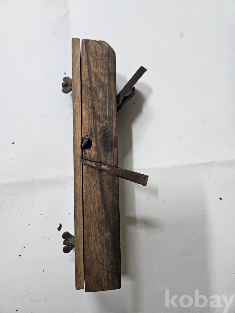 나비 너트 (Wing Nuts): 좌우에 두 개의 나비 너트와 나사(볼트)가 보이며, 이는 도구의 폭이나 높이를 조절하거나, **대팻날(또는 칼날)**을 고정하는 역할을 했을 것으로 보입니다. 이는 특히 현대의 마킹 게이지나 일부 특수 대패에서 볼 수 있는 구조입니다.