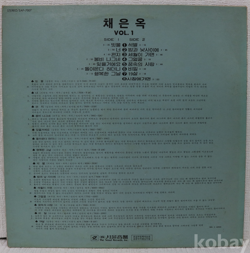 | 자켓상태 | EX : 약간의 마모, 모서리 찢김 존재 | 음반상태 | VG : 생활 기스 다수, 가벼운 노이즈 존재 | 발매정보 | 초반 | 가사지여부 | 유 |