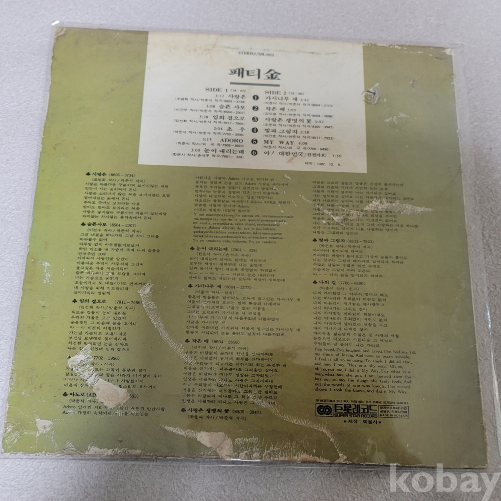| 자켓상태 | EX : 약간의 마모, 모서리 찢김 존재 | 음반상태 | EX : 재생에 영향 없는 가벼운 기스 존재 | 발매정보 | 알수없음 | 가사지여부 | 무 |