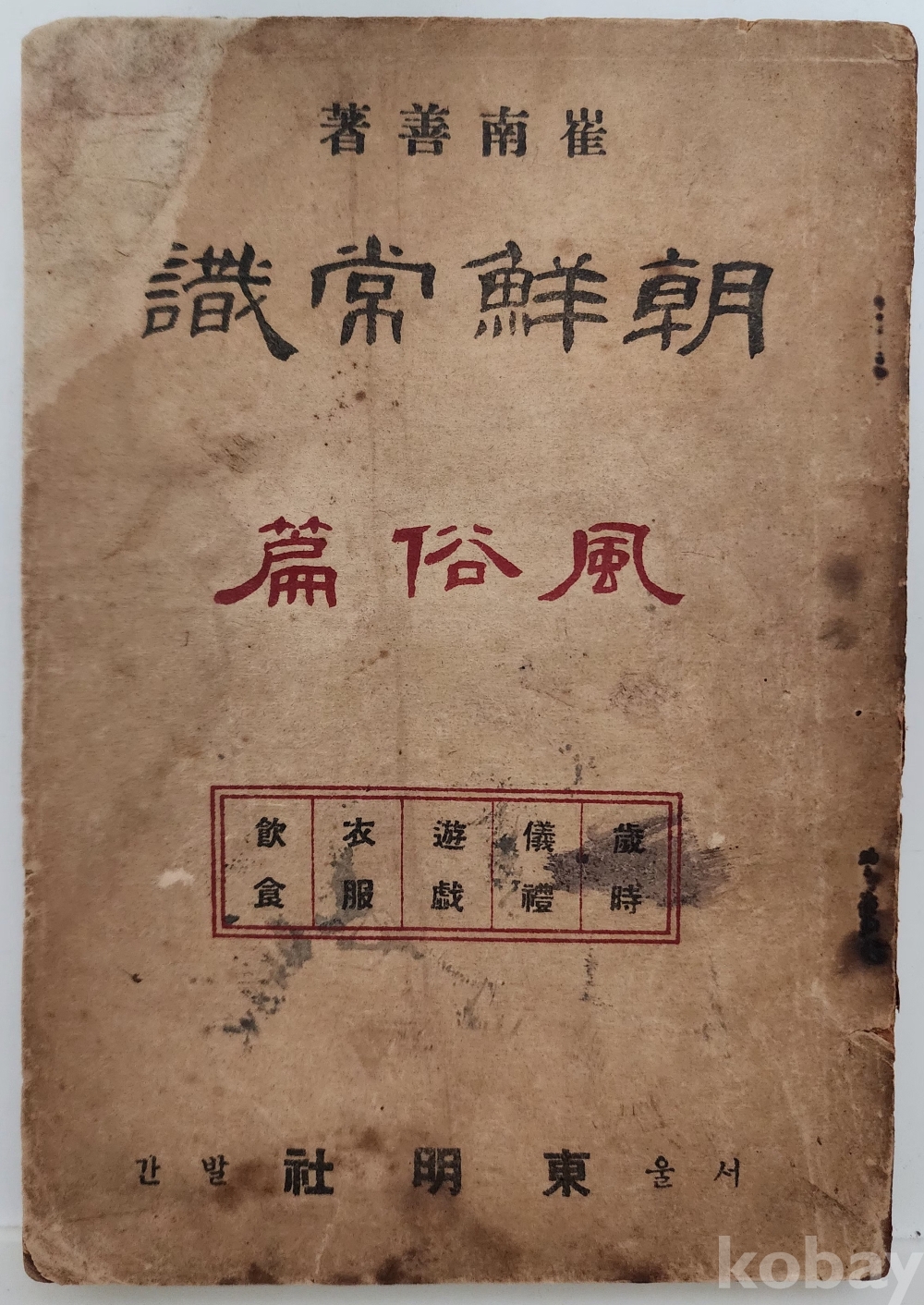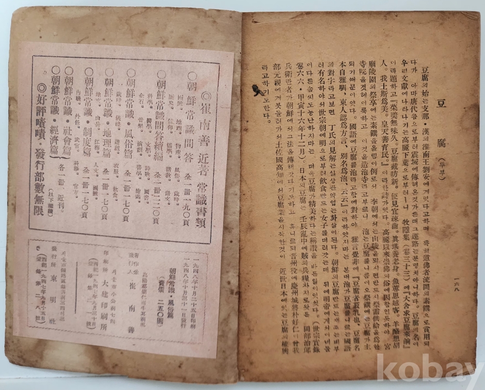 자료명/ 저자/ 발행/ 형태사항 | 『조선상식 풍속편 · 朝鮮常識: 風俗編』/ 최남선(崔南善, 1890~1957) 著/ 서울: 東明社, 1948.10.31/ 168p. 광고·판권기 페이지(169p~176p) 낙장. 판권지 복사, 앞표지 상단 왼쪽 훼손, 대체적으로 낡았음. |
