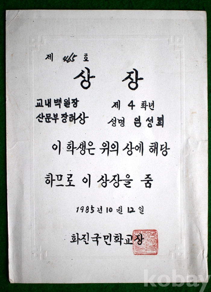 (상장 및 졸업장) 1985년 화진국민학교의 상장 - 교내 백일장 산문부 장려상