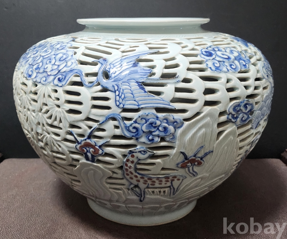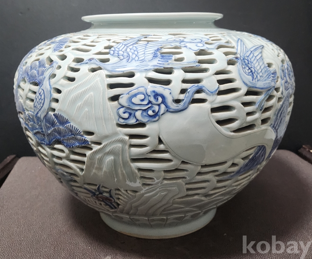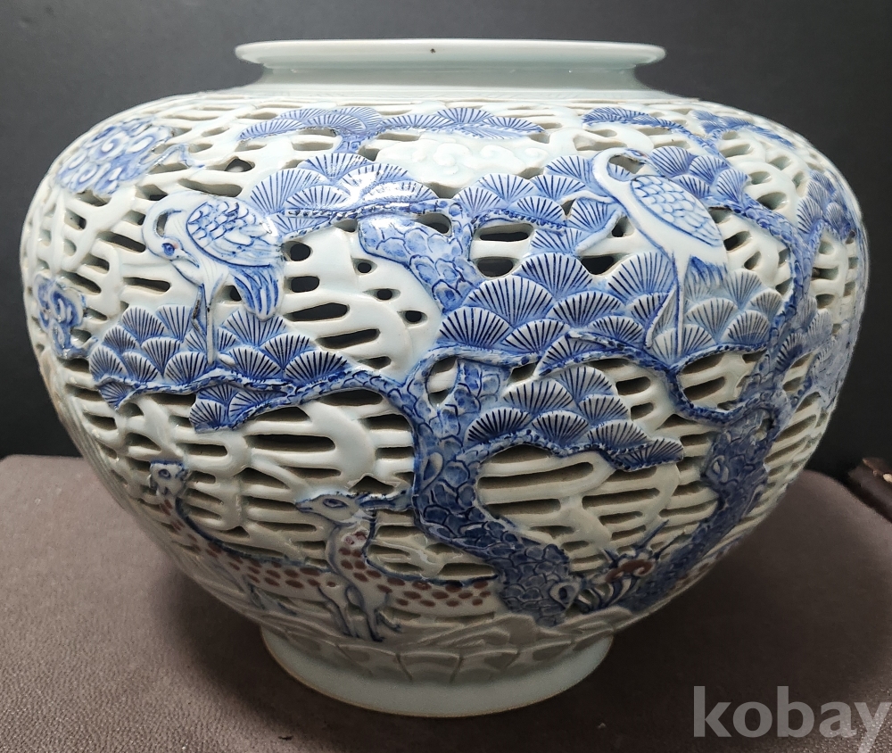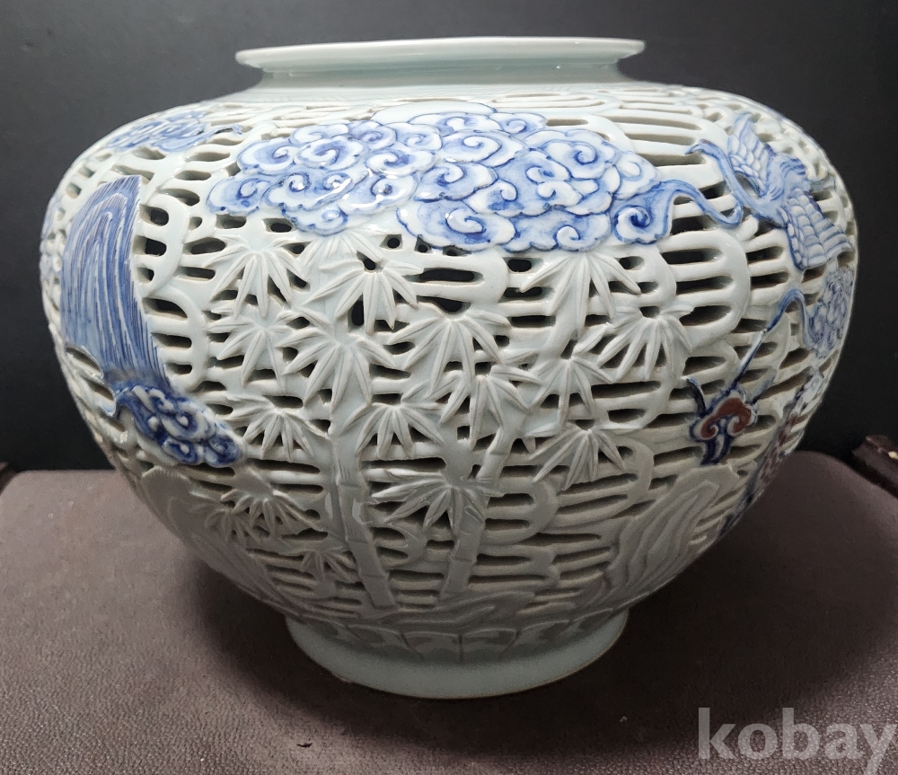 <1세대 도예가> 호산[呼山] 안동오[安東五] 백자청화투각장생문호 白磁靑華透刻長生紋壺
