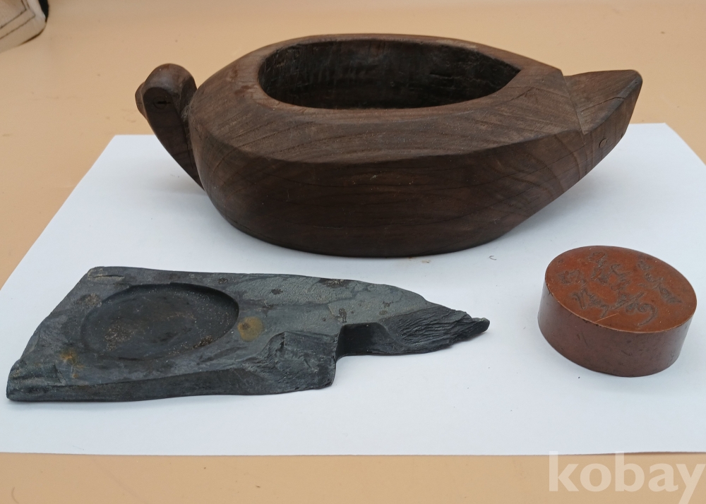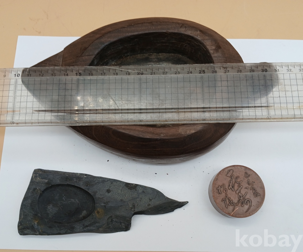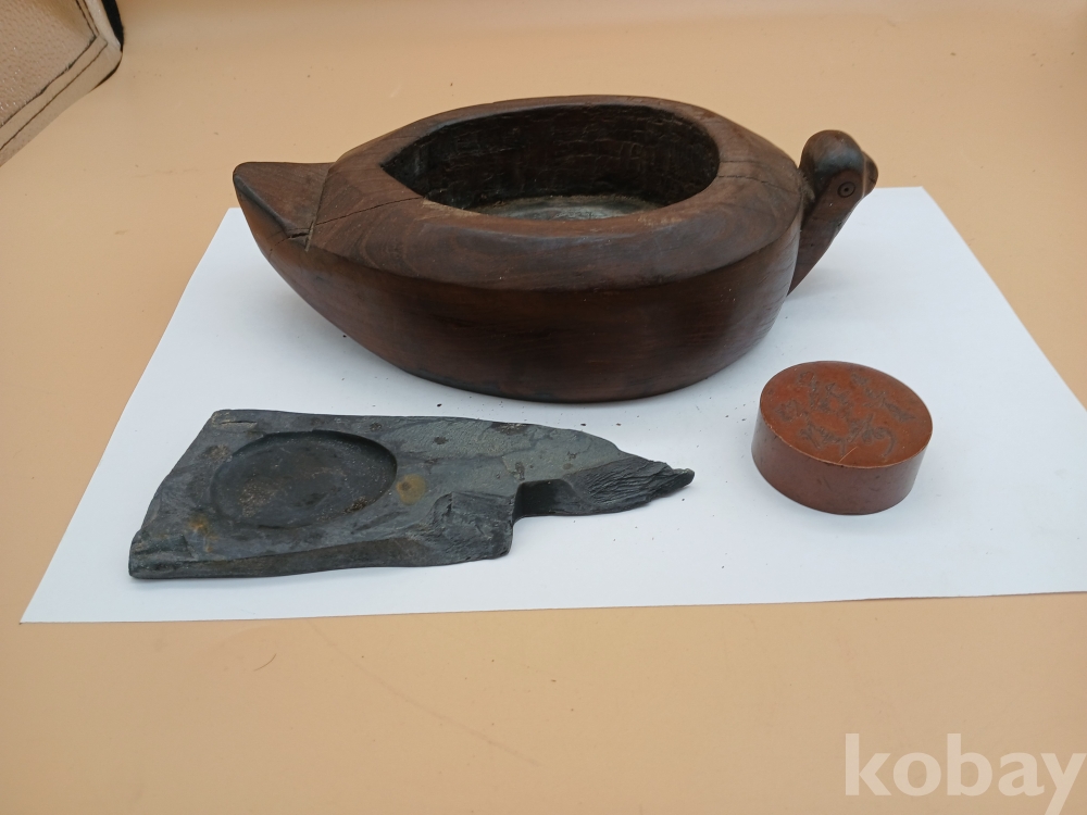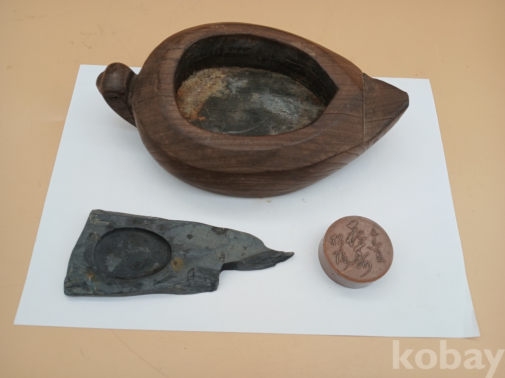 자연석 벼루와 동 문진, 나무 필세입니다.