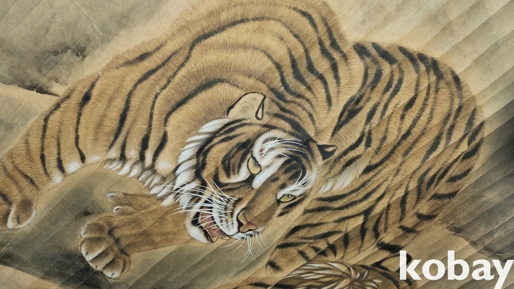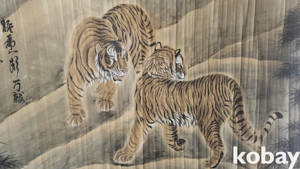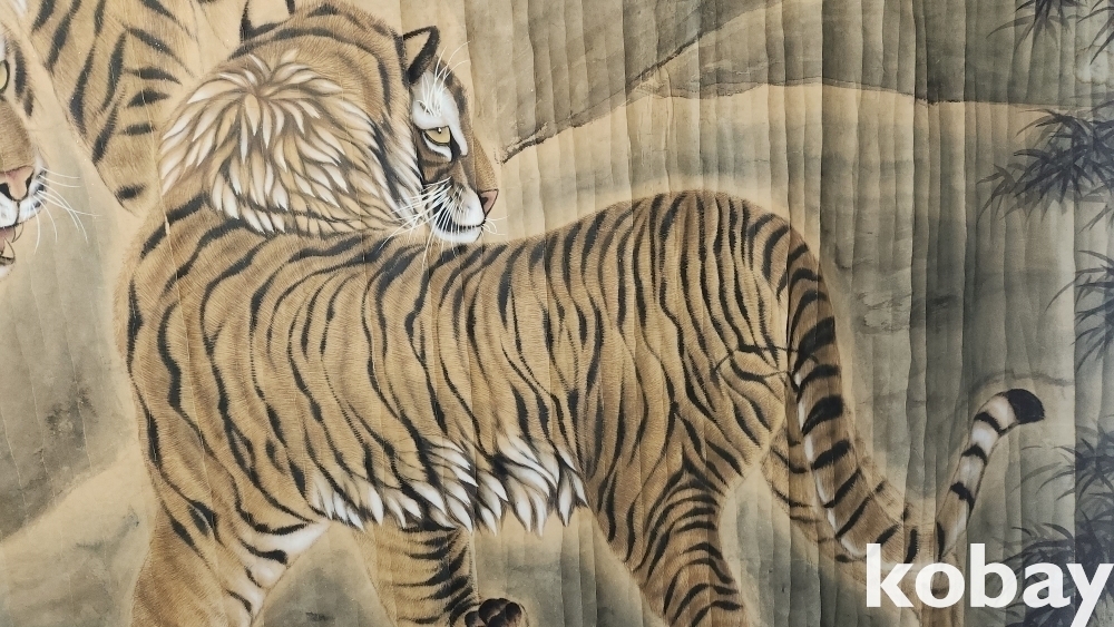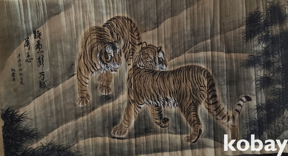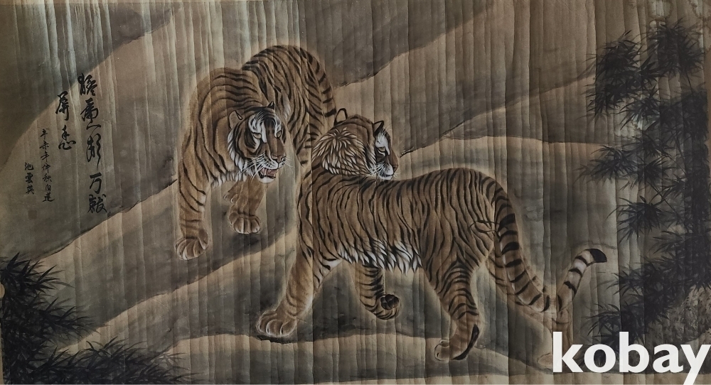 지운영(地雲英) 수결이 보이는 종이에 채색 한 대형급 대나무와 호랑이(竹虎) 그림입니다,