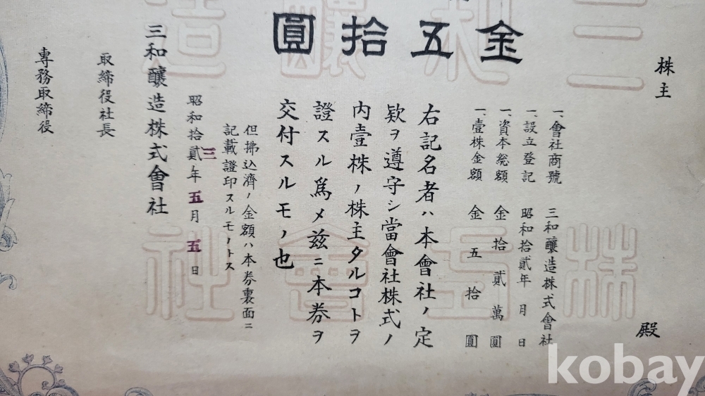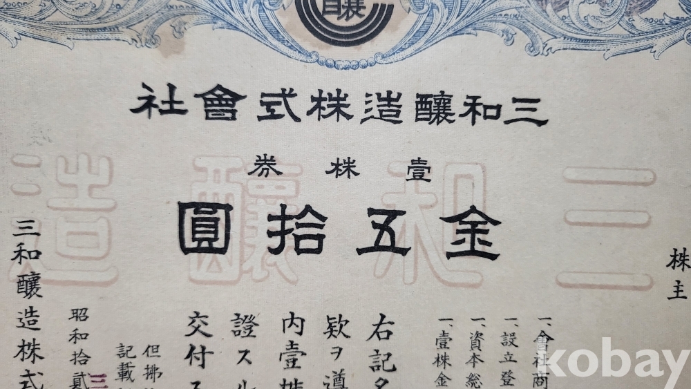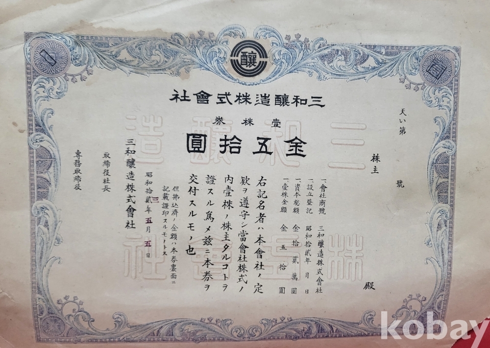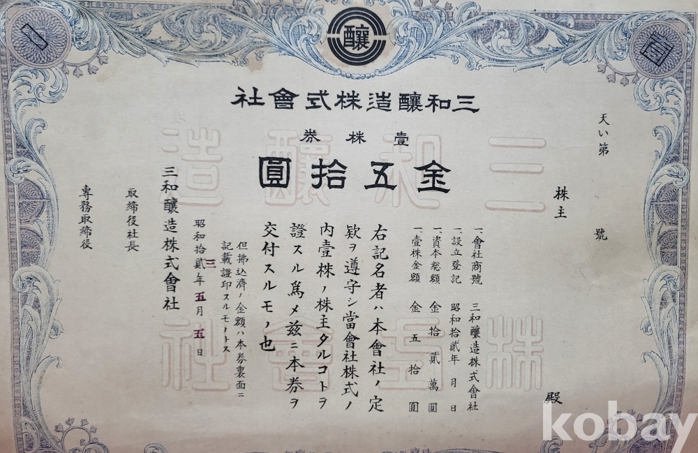 1938년 (소화12 년) 삼화양조 주식회사 주식증서 진본입니다,