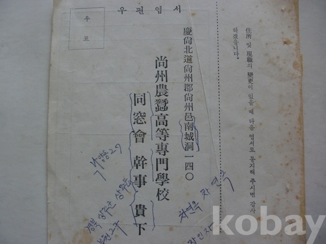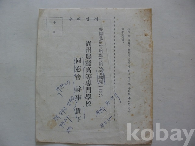 경북 상주농잠고등전문학교 동창회 (졸업년도 과 성명 직장 등 인적사항 기재용 우편엽서)