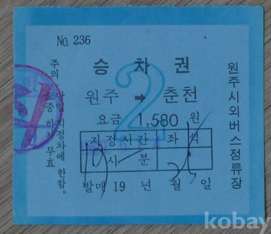 1990년대 원주 - 춘천 시외 버스 1580원 승차권