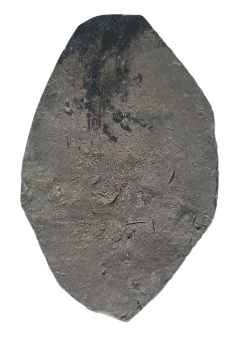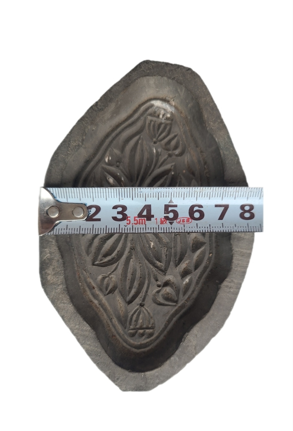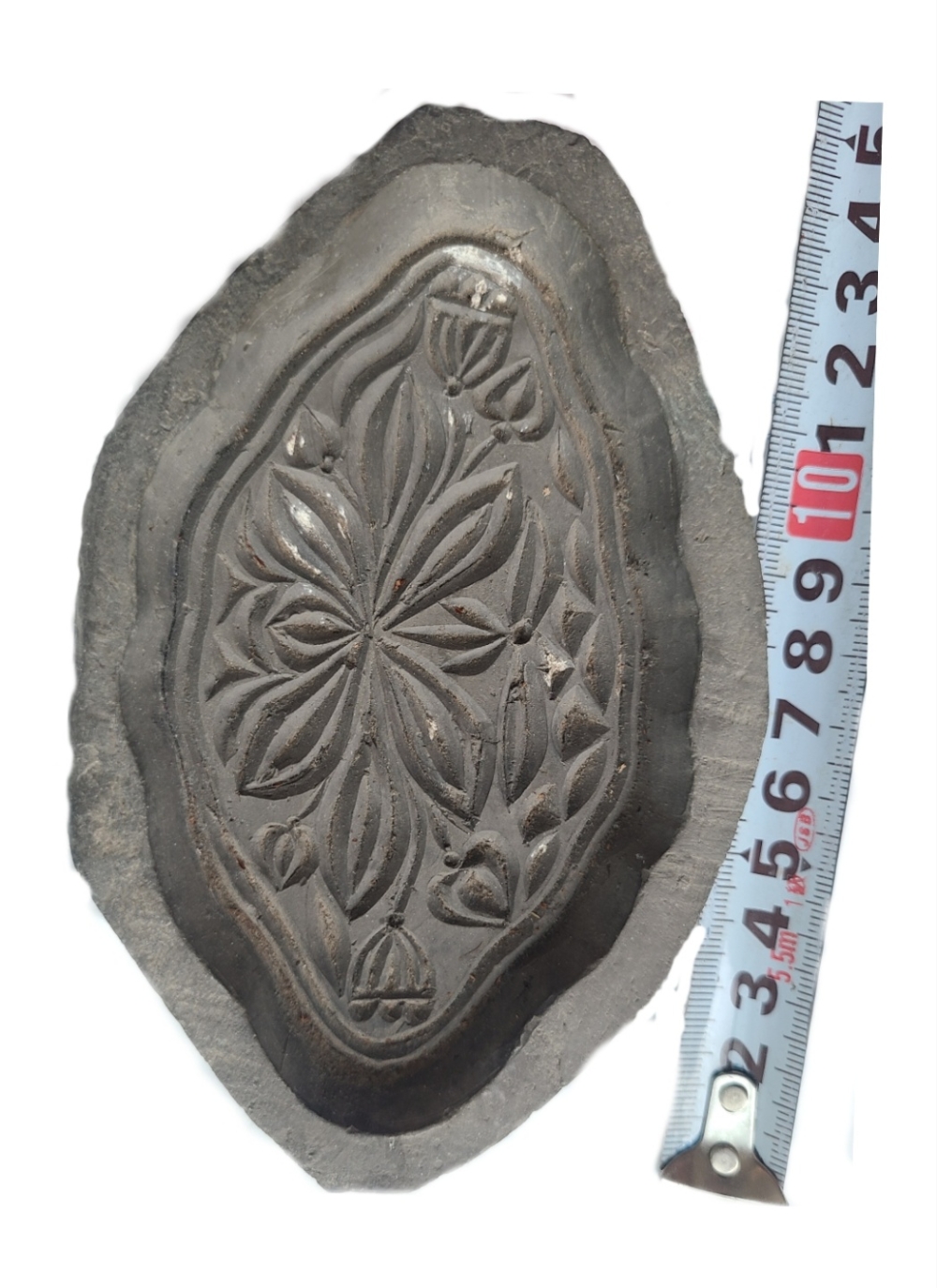 흙을 구운 토기 재질로 보이는 판으로, 안쪽 면에 섬세하고 반복적인 문양이 음각되어 있습니다.