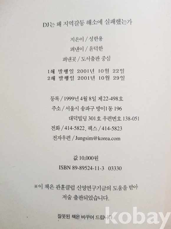 설명: 이 책은 김대중 대통령이 당선하고 2001년에 나온 책으로 지역갈등 실패의 요인을 정리한 책입니다.