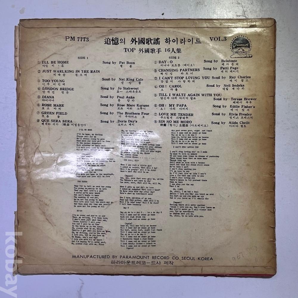追憶의外国歌謠 하이라이트 TOP外国歌謠 씨리즈 1集 LP판입니다.