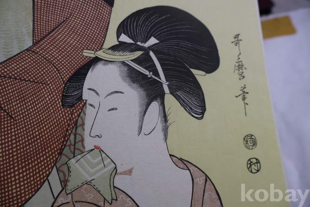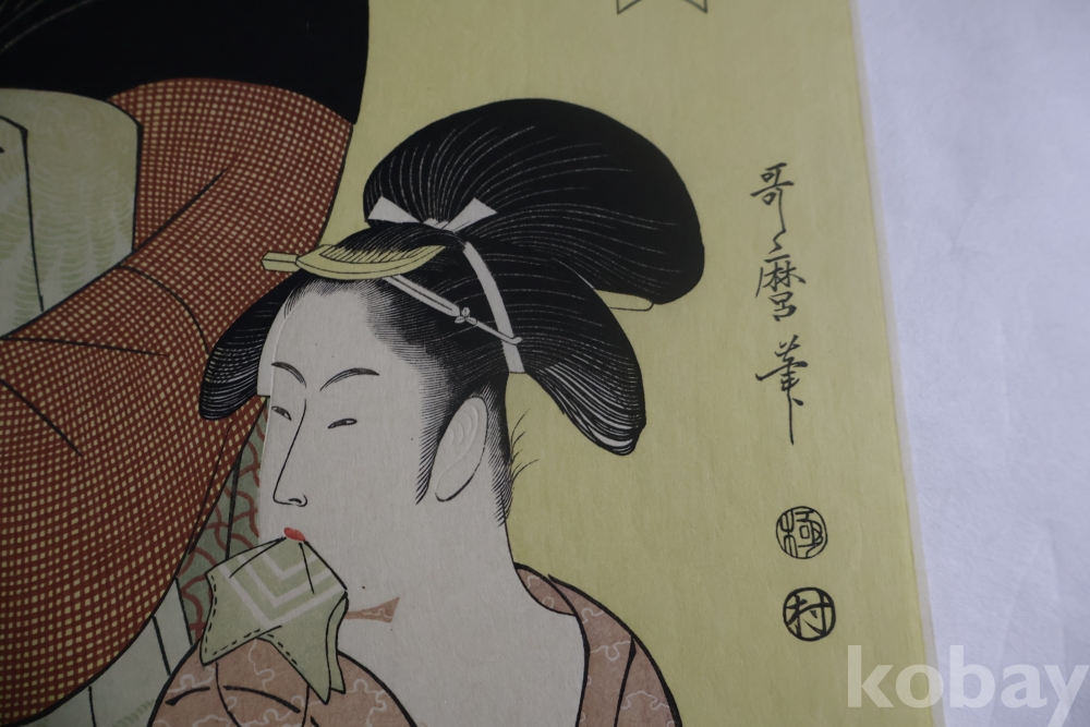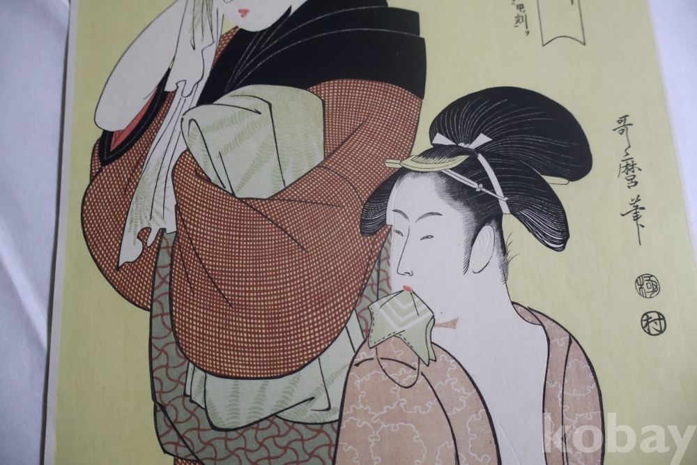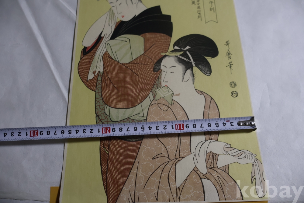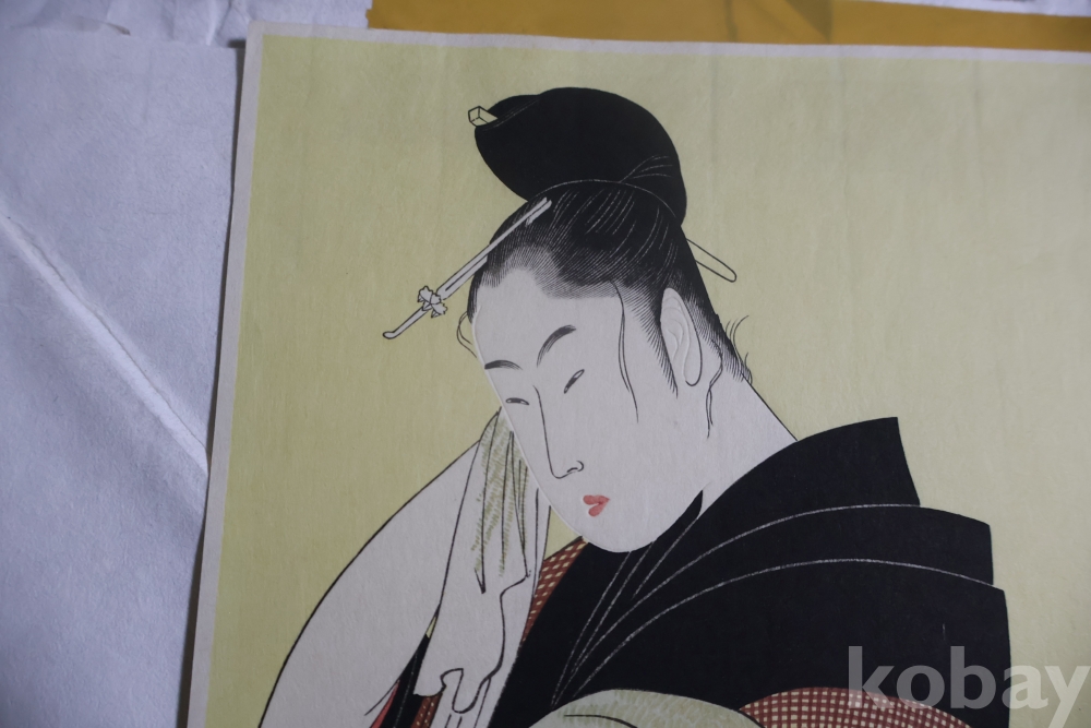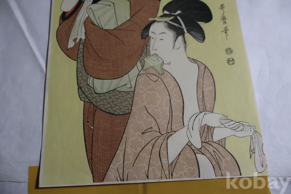 우타마로의 소화중기의 목판화 임니다 노란 배경을 가진 무척 귀한 목판화 임니다 섬세 정교 한 명품 임니다 싸구러 일반 프린트 아님니다 옛날 전통 방식으로 만든 목판화 임니 다