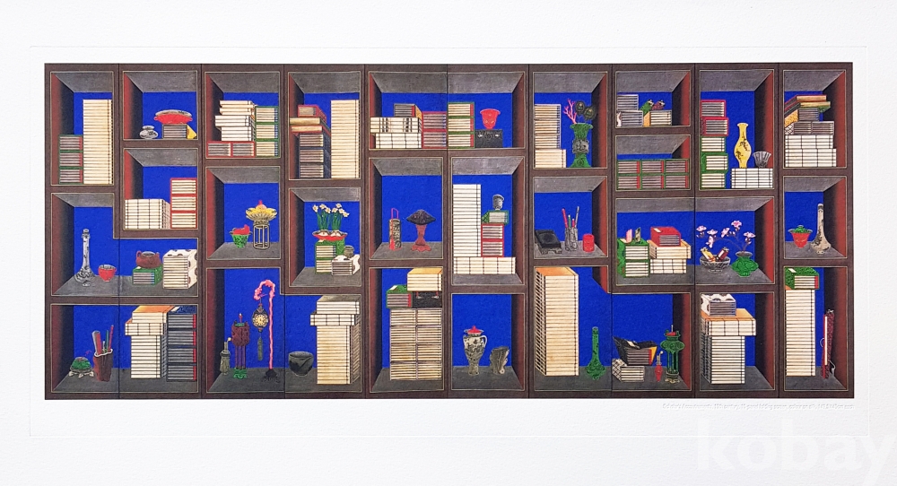 민화풍으로 그린 고급 책가도이다. 언뜻 궁중 책가도로 보이지만, 한쪽 방향으로만 전개되는 공간 구성이나 칸막이에 가려져