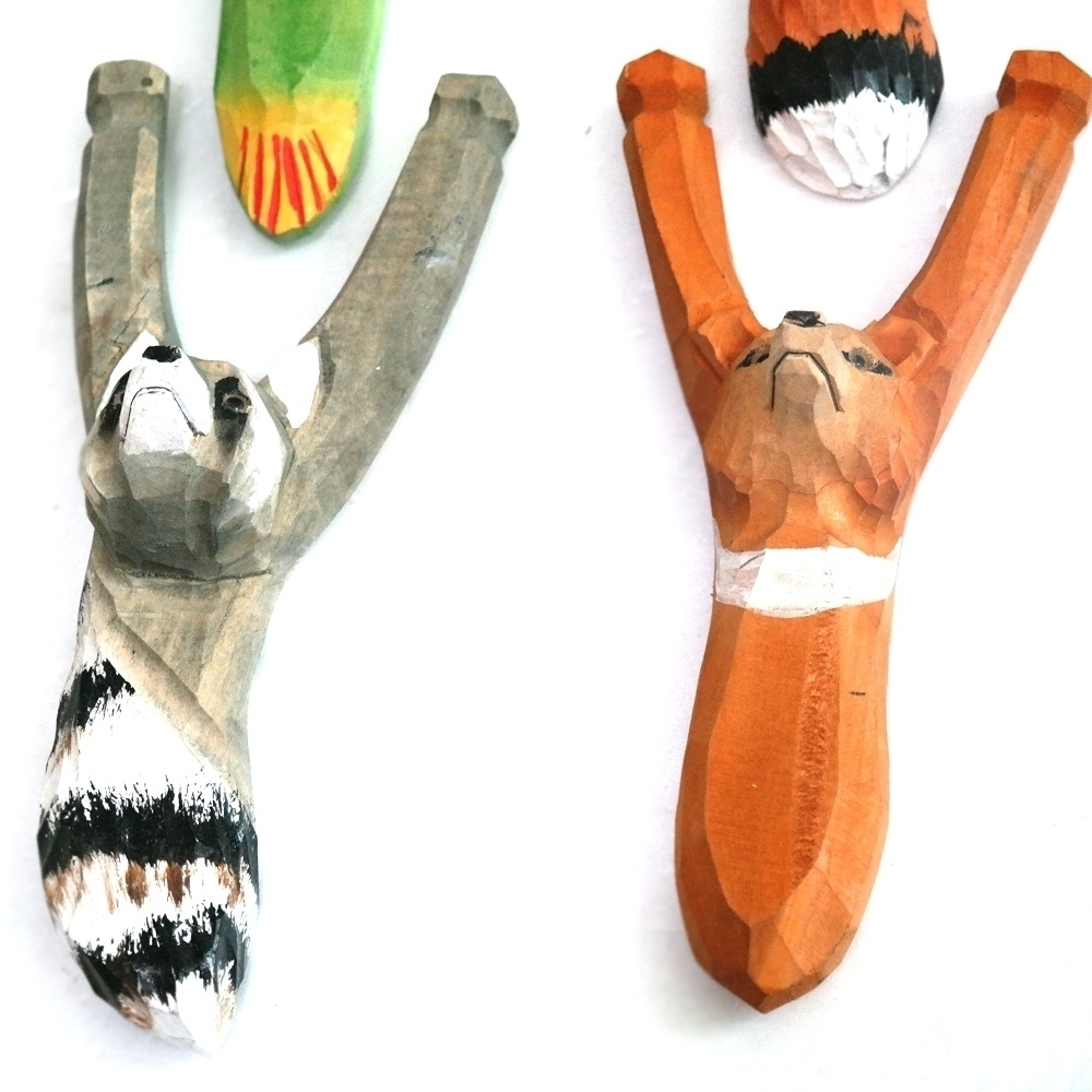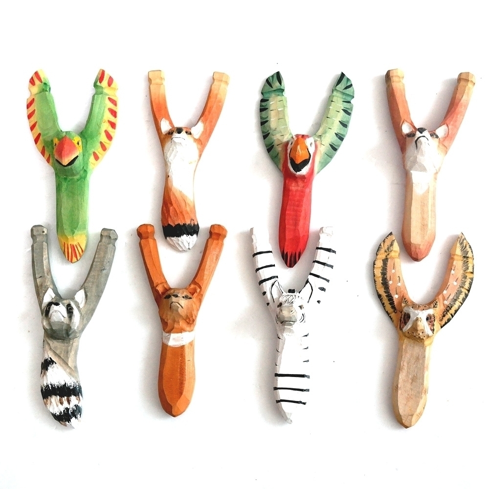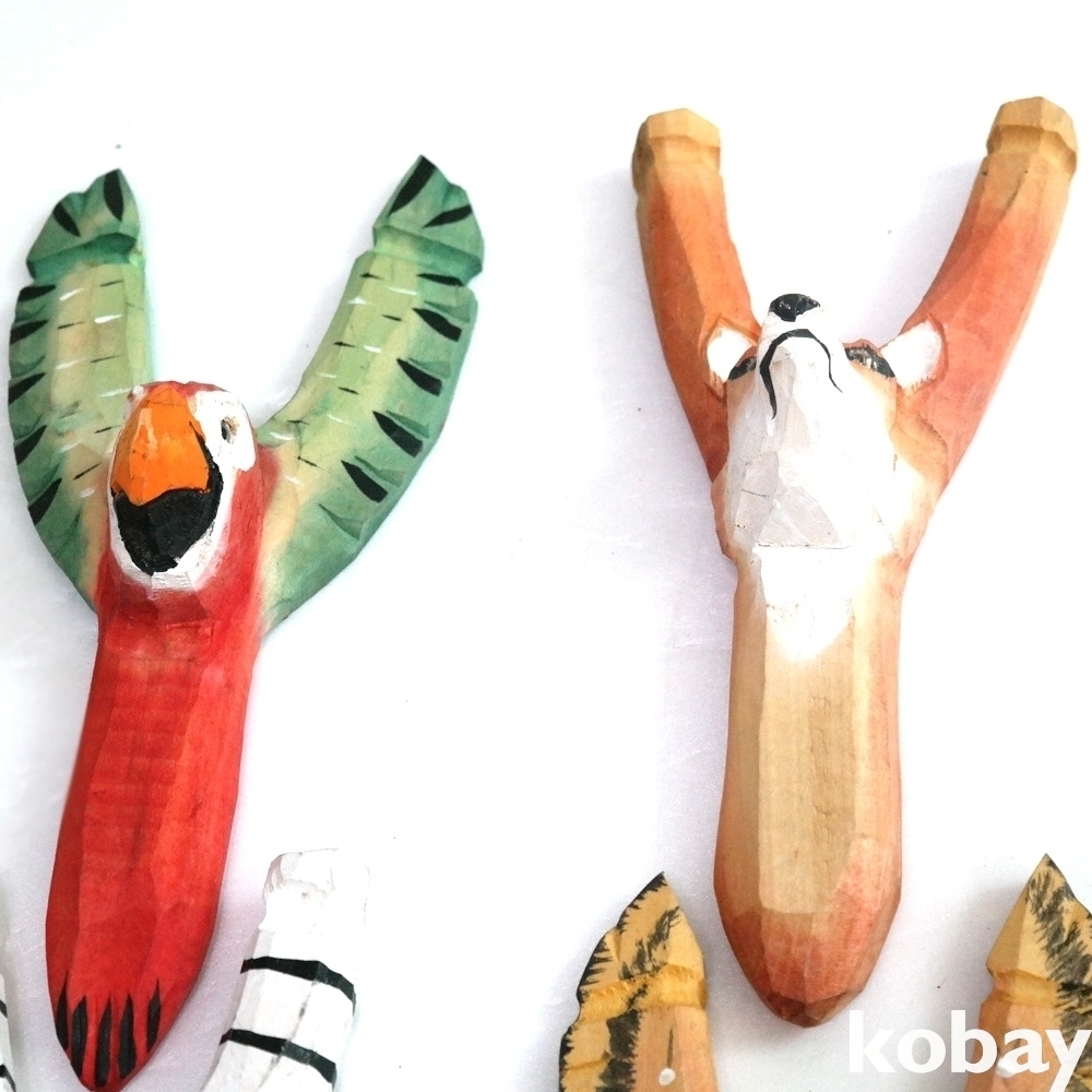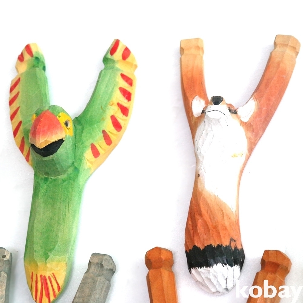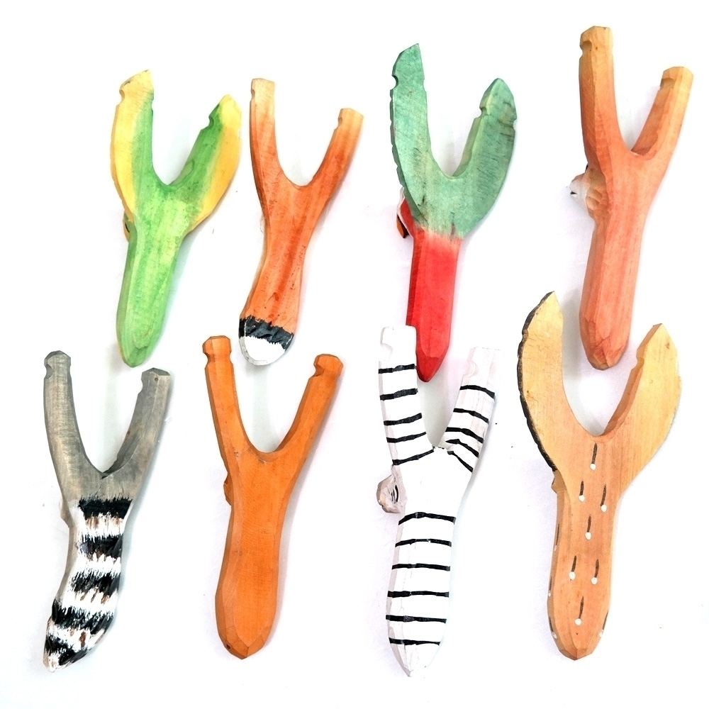 나무를 조각하여 만들어진 새총모양의 장식 8P 입니다.
