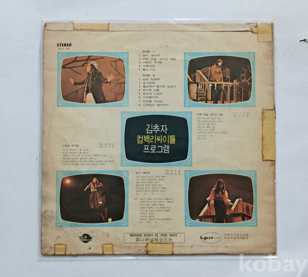 | 자켓상태 | VG : 주름, 접힘, 모서리 찢김 다수 | 음반상태 | EX : 재생에 영향 없는 가벼운 기스 존재 | 발매정보 | 알수없음 | 가사지여부 | 무 |