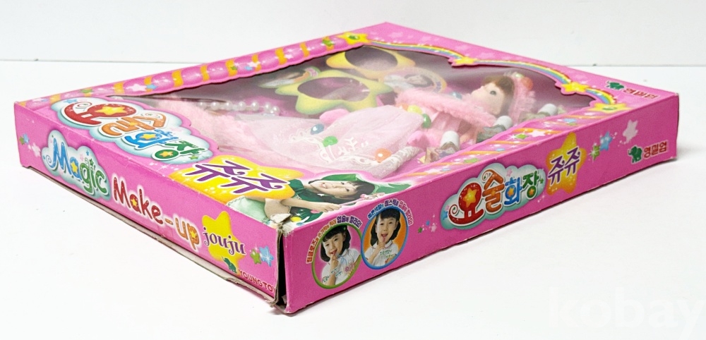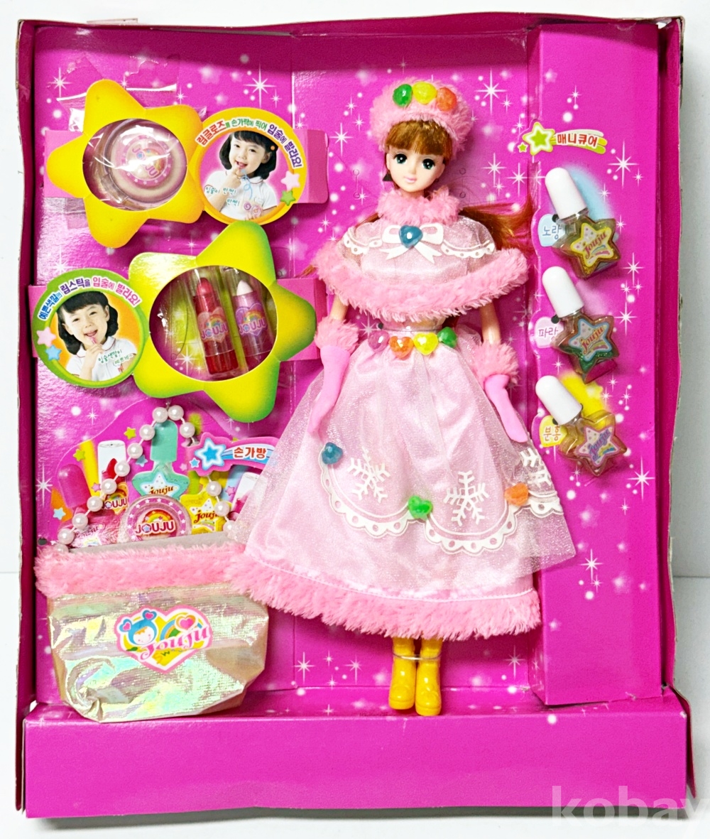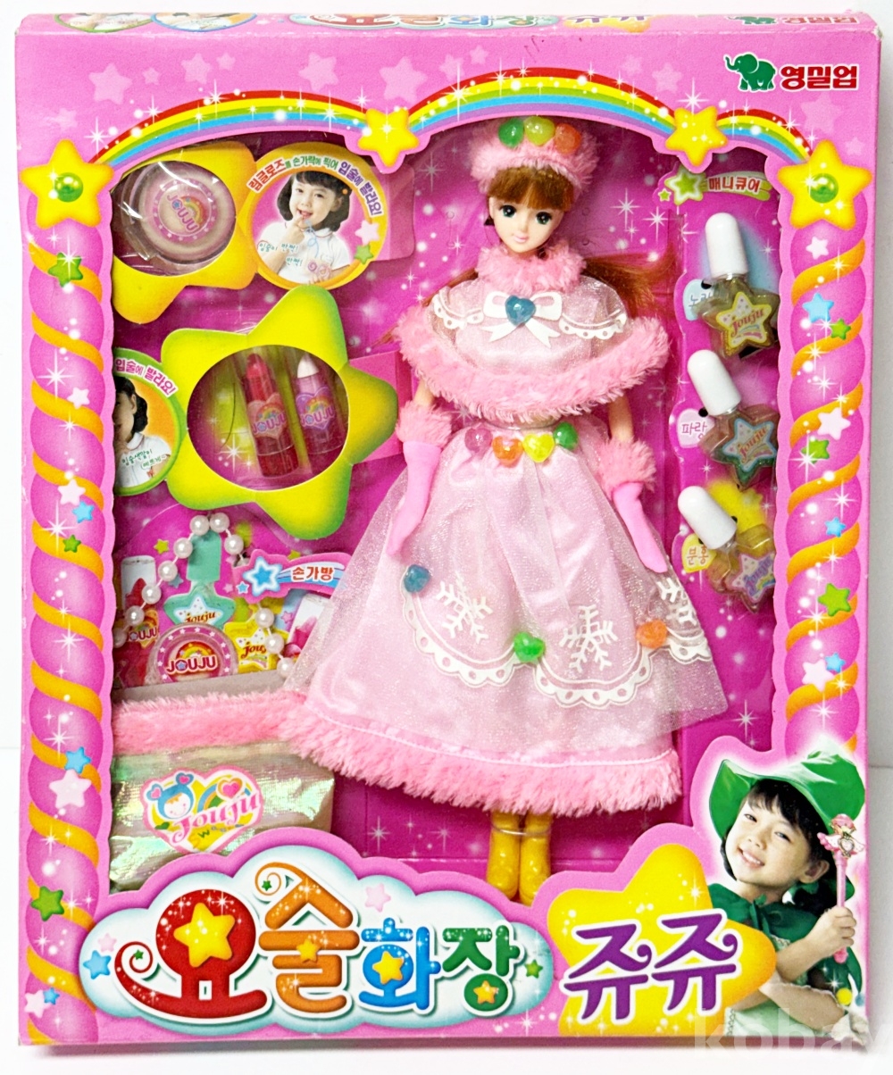 상품설명 | 2003년 영실업에서 발매한 '요술화장 쥬쥬' 고전 인형 세트이다. 매니큐어, 립스틱, 손가방 등 소품이 포함되어있다. | ||