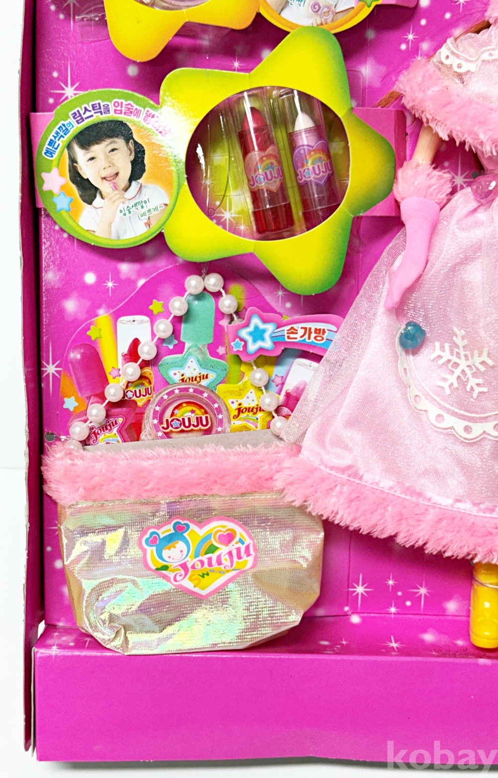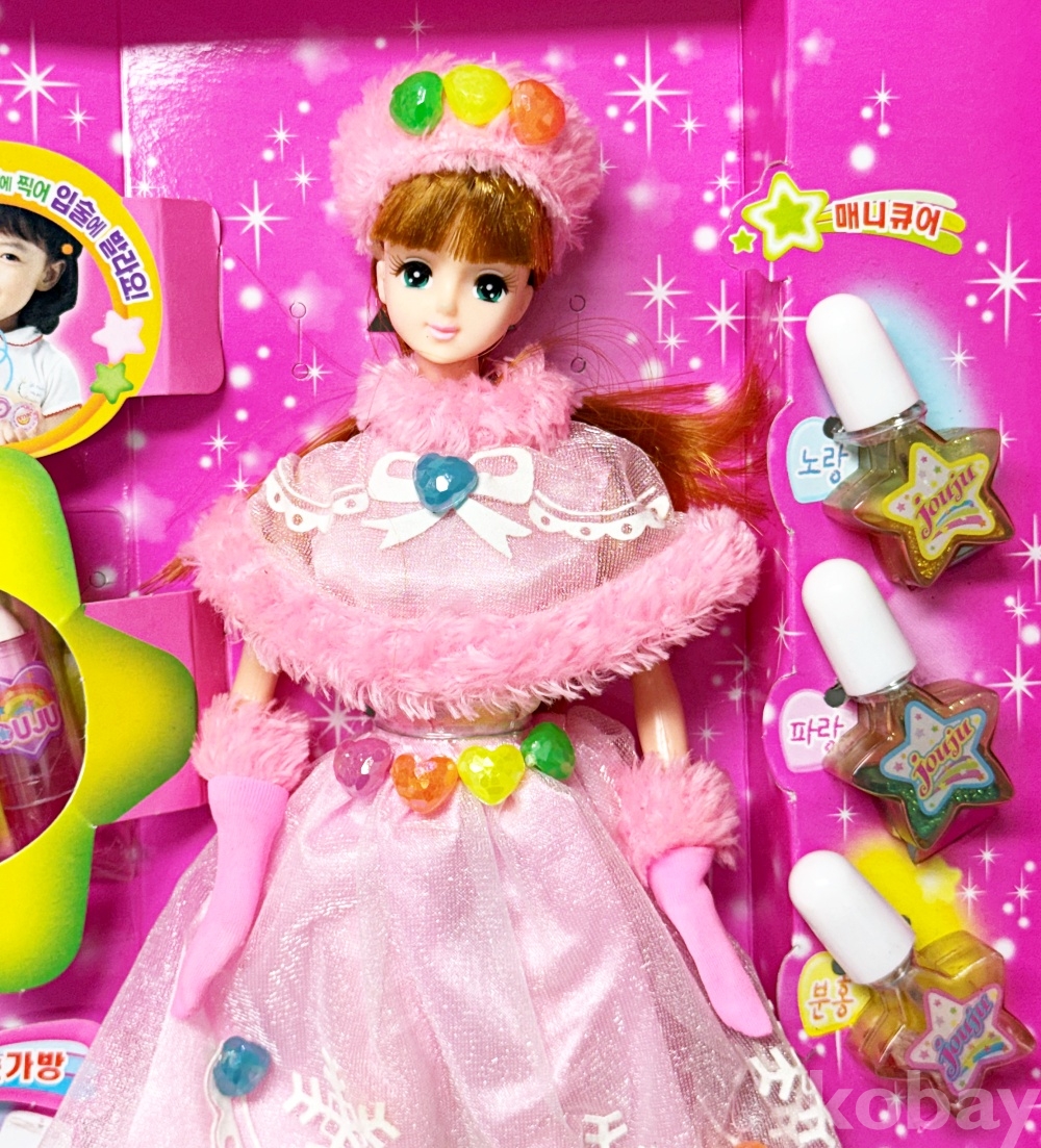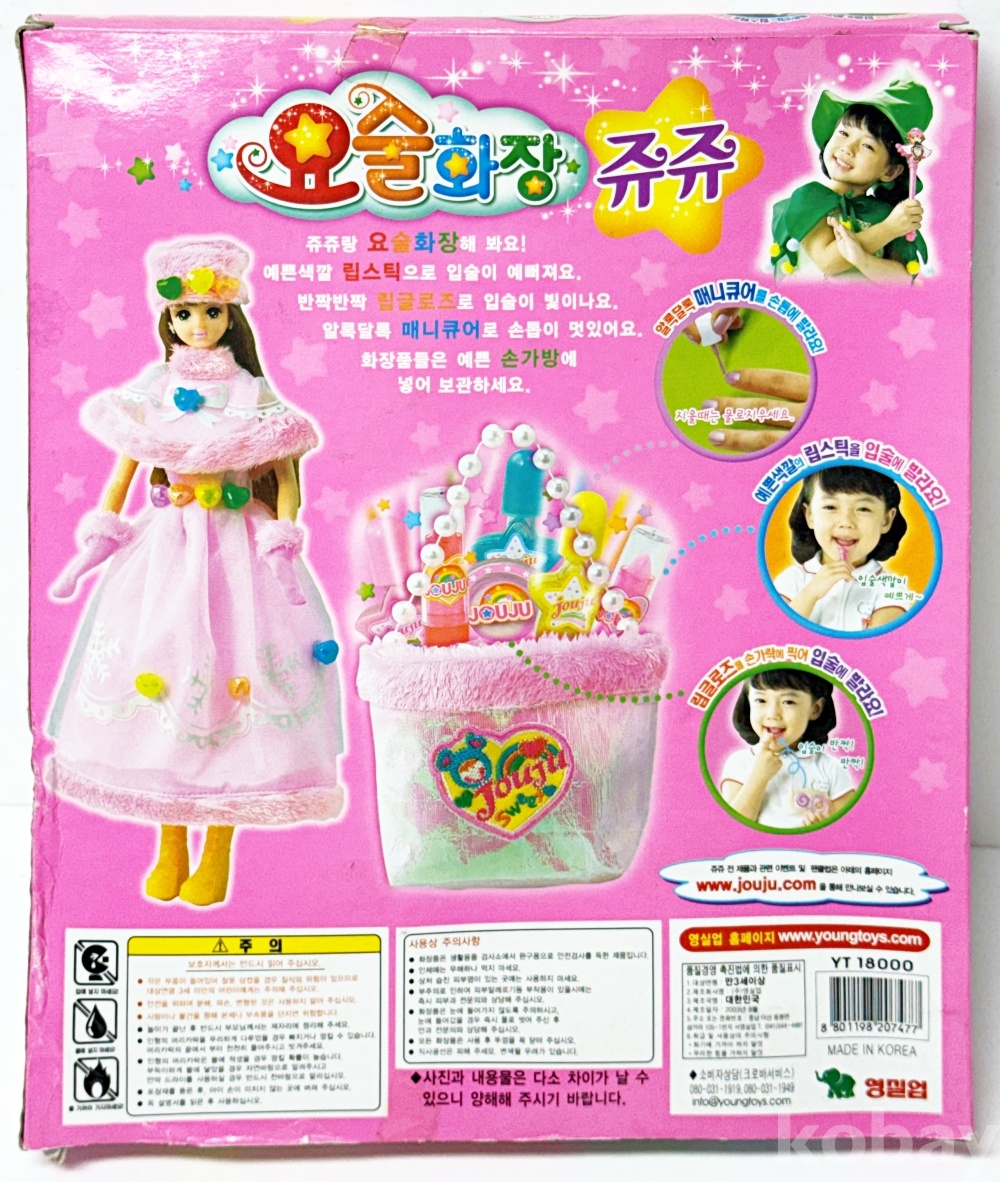 상품설명 | 2003년 영실업에서 발매한 '요술화장 쥬쥬' 고전 인형 세트이다. 매니큐어, 립스틱, 손가방 등 소품이 포함되어있다. | ||