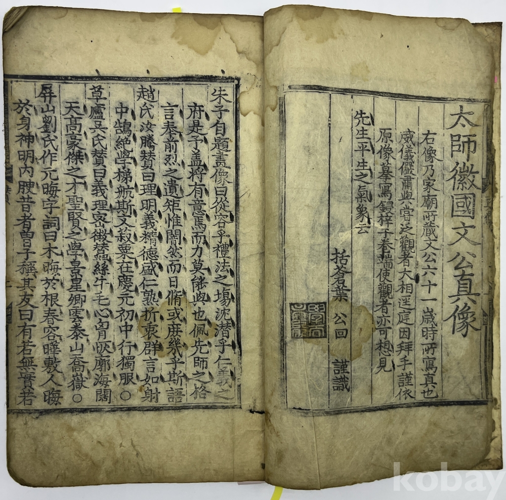 설 명 | 태사휘국문공연보(太師徽國文公年譜)는 명대의 엽공회(葉公回)가 남송 주희의 연보(年譜) 관련 구본(舊本)을 모아 행장(行狀), 포전(褒典), 기문(記文)을 증보하여 완성한 것으로 본 출품물은 조선에 전래되어 복각본으로 간행된 것이다. 이 과정에서 간행과 교정에 직접 관여한 이황과 배삼익(裵三益, 1534-1588)의 문집과 서간에 수정 과정이 자세히 나와 있다. 본 책에는 손원정의 문공선생년보중간서를 비롯하여, 왕중노의 문공연보서, 태사휘국문공진상 및 섭공회의 지 등이 차례대로 수록되어 있다. 말미에는 ‘태사휘국문공연보종(太師徽國文公年譜 終)’으로 끝난다. 흔히 이 책(연보)의 다른 판본에 흔히 보이는 손사제(孫思齊)의 발문과 조선 간기인 ‘龍集壬申夏 鏡城府 開刊 (乙丑 改刊)’는 보이지 않는다. (말미의 ‘흡서구촌황씨간(歙西仇村黃氏刊)’은 중국 간기) 2책의 ‘연보 부록’ 마지막에 붙어 있을 가능성도 있지만 기존의 판본 형태보다는 더 오래된 것을 알 수 있다.