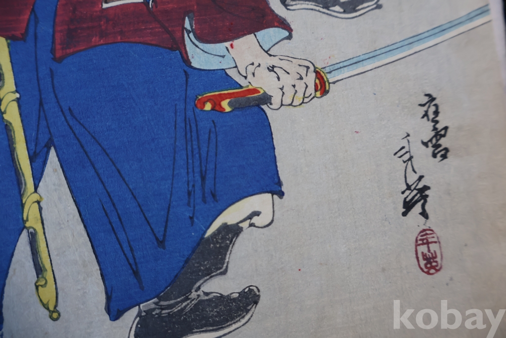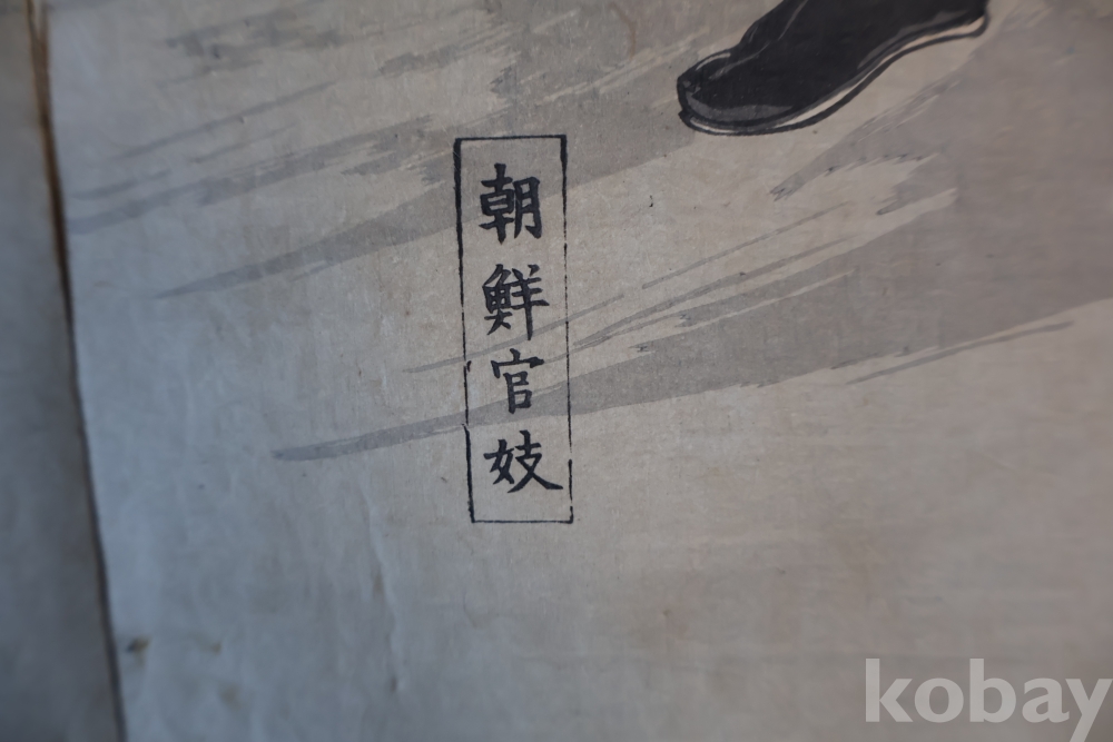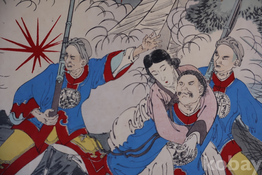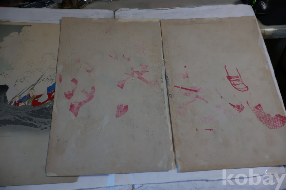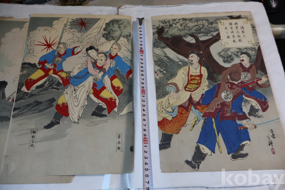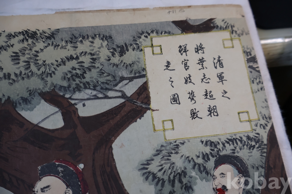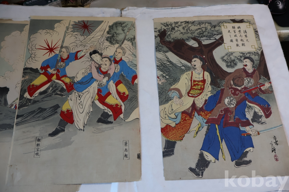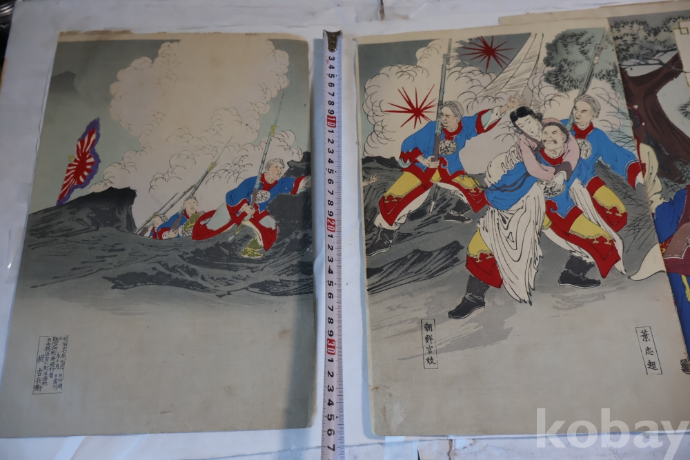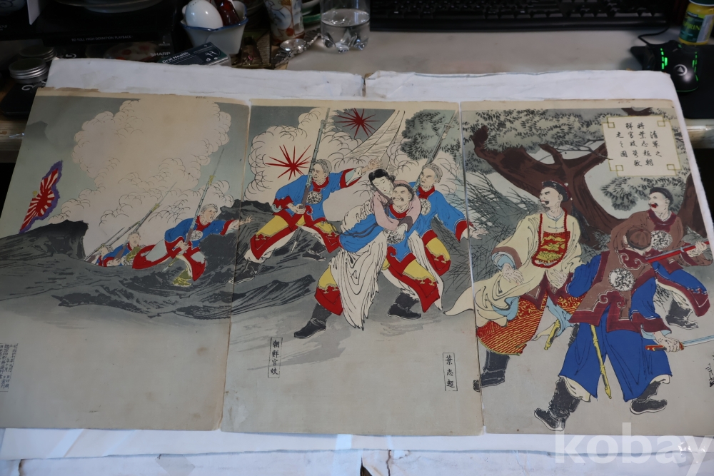 오리지날 목판화 청일 전쟁 임니다 제작 날자 화가의 낙관이 보이며 특히 역사적 사실인 청나라 장수의 조선 관기를 엎고 도망 하는 그림을 가진 극히 귀한 명화 임니다 명치 27년 원본 임니다