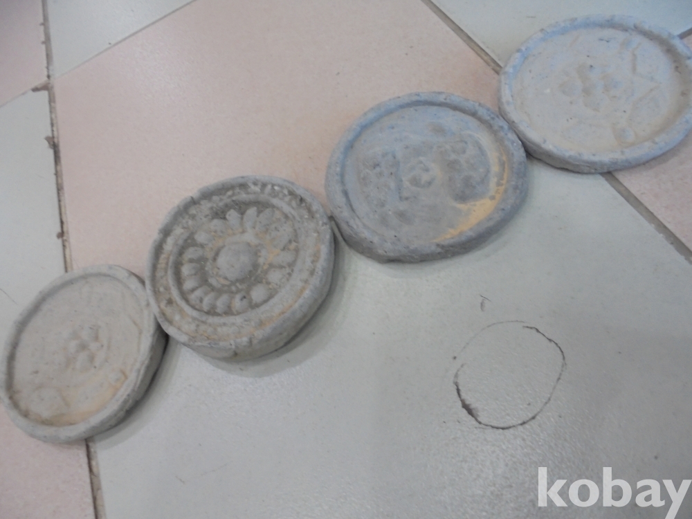 오래된 기와수막새로 오래되여 무늬가 선명하지못하나 귀한모양의무늬로 연구대상의 아주오래된 기와수막새 4점