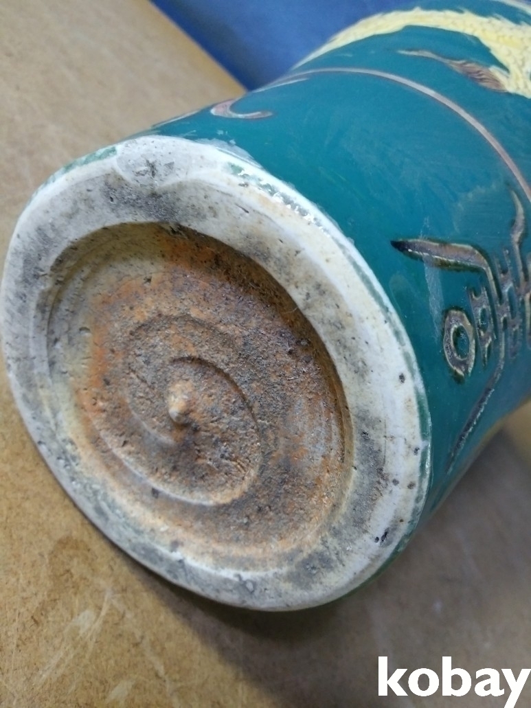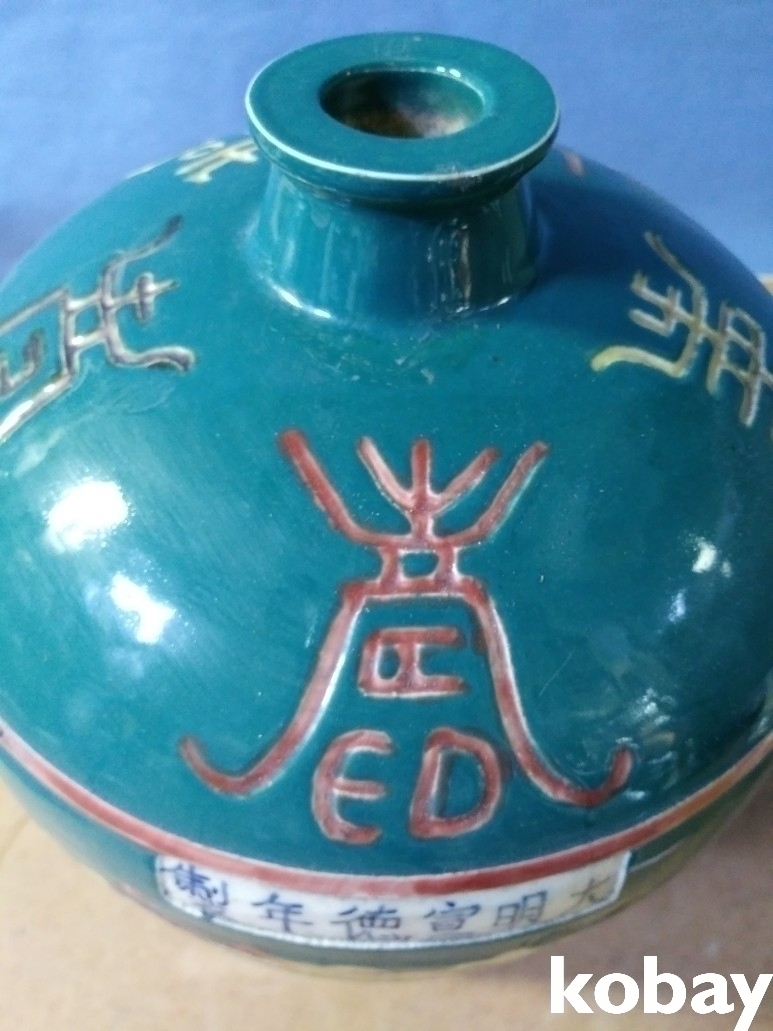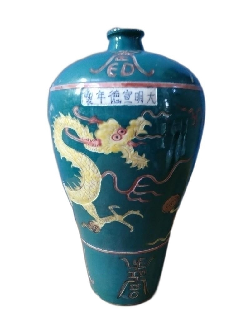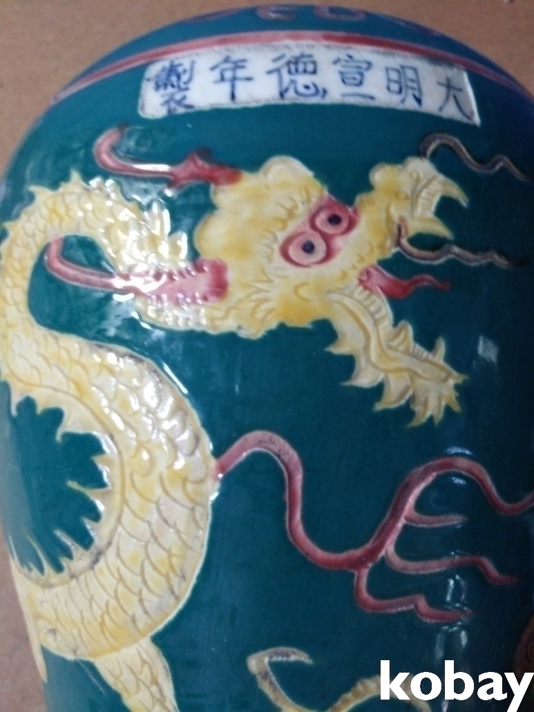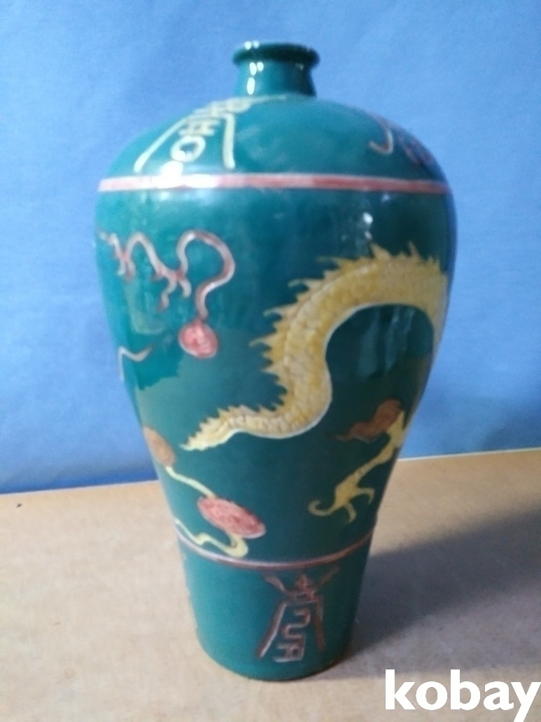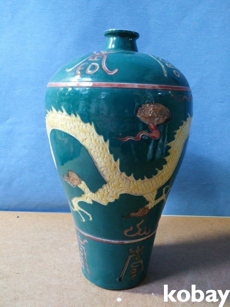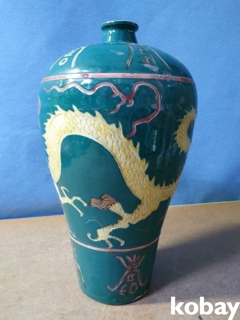 용과 글씨 문양이 음각으로 있는 매병형 도자기 입니다.