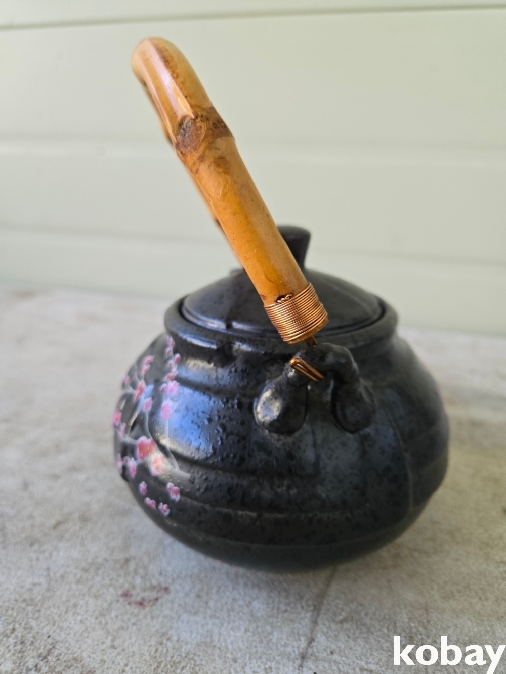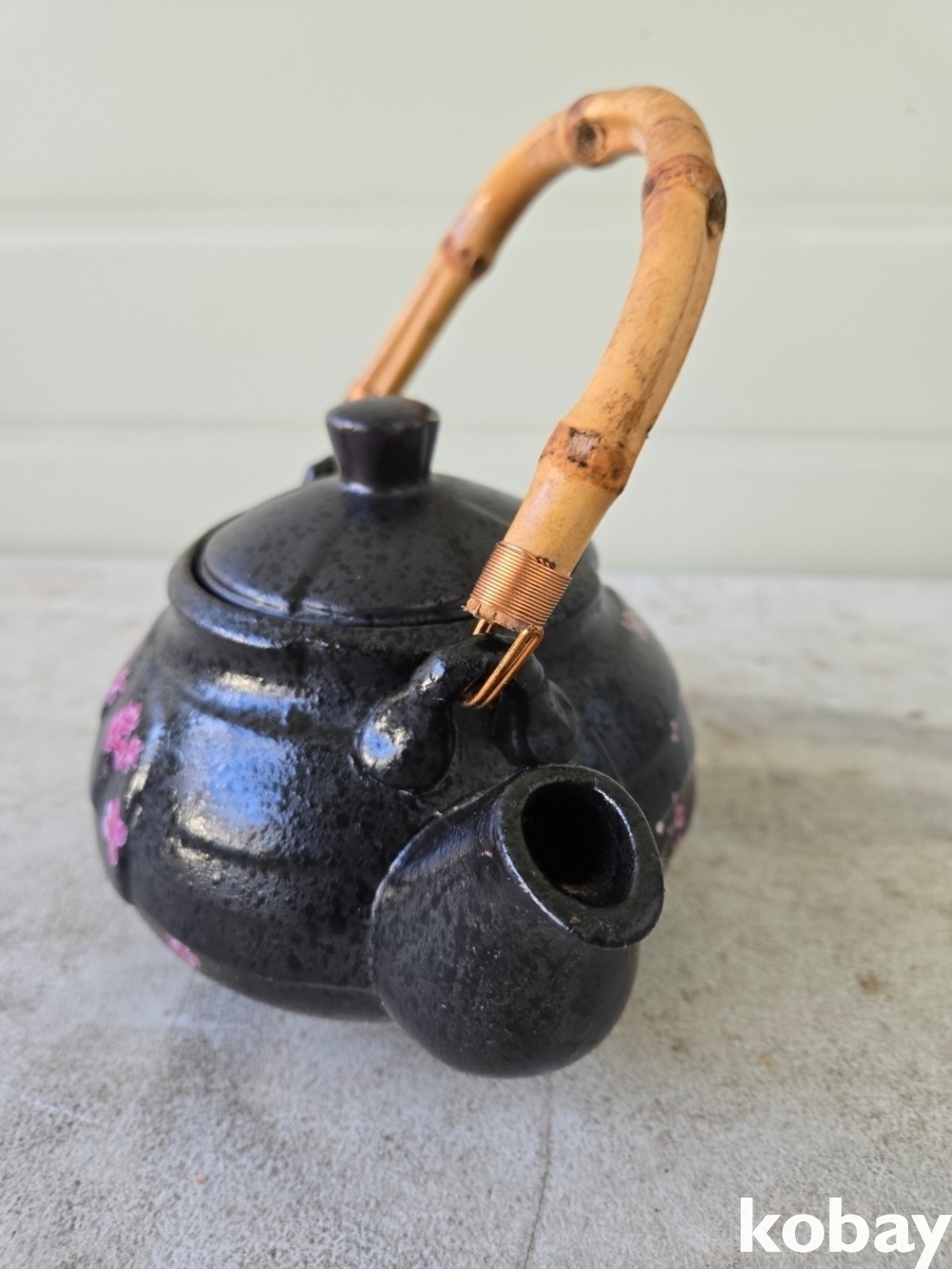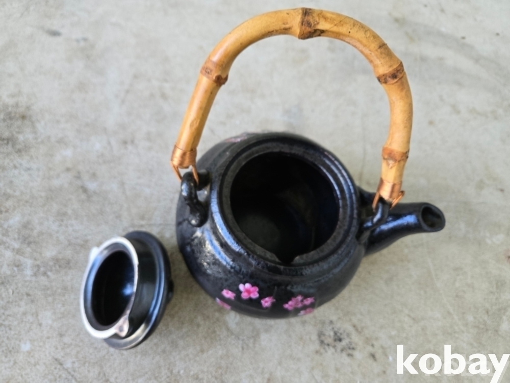 대나무 손잡이에 꽃 그림이 있는 다기 주전자 입니다.
