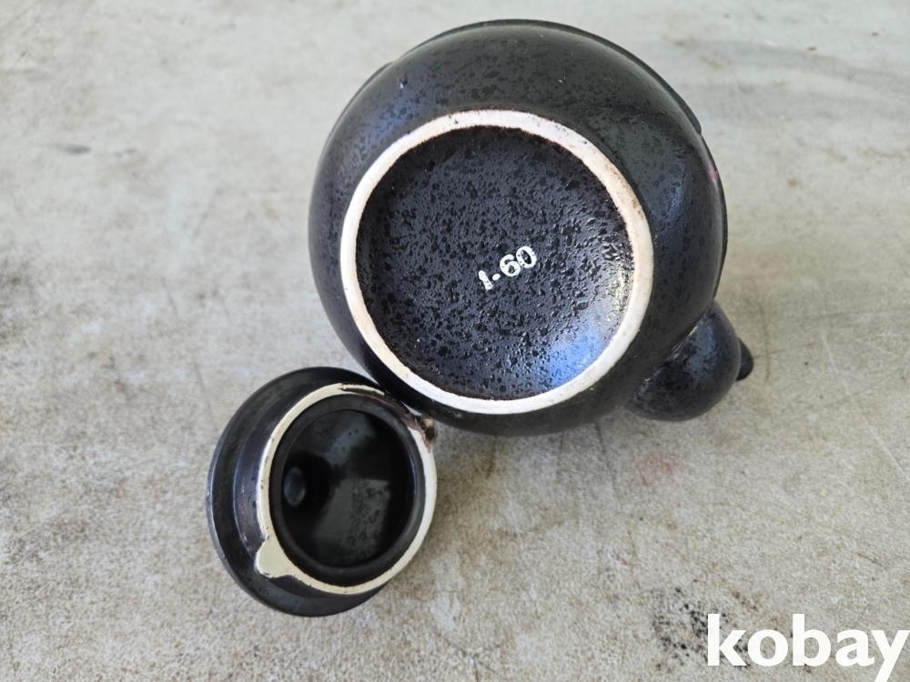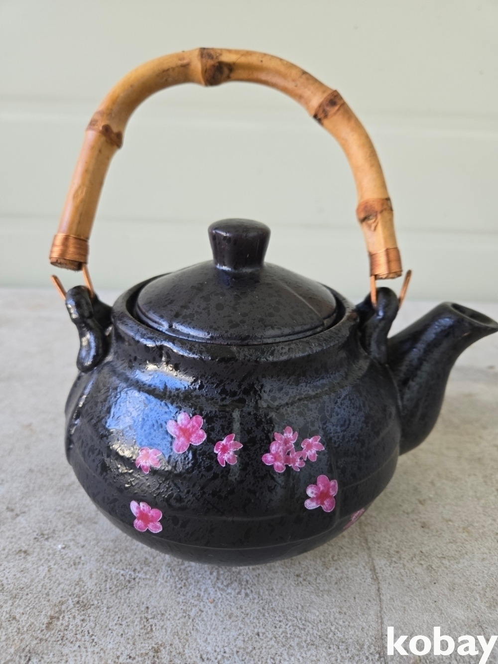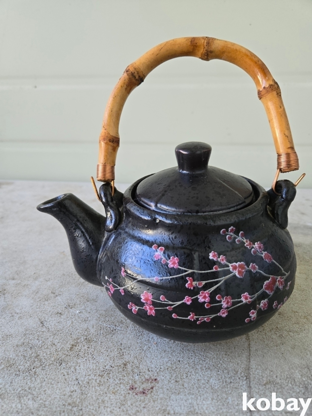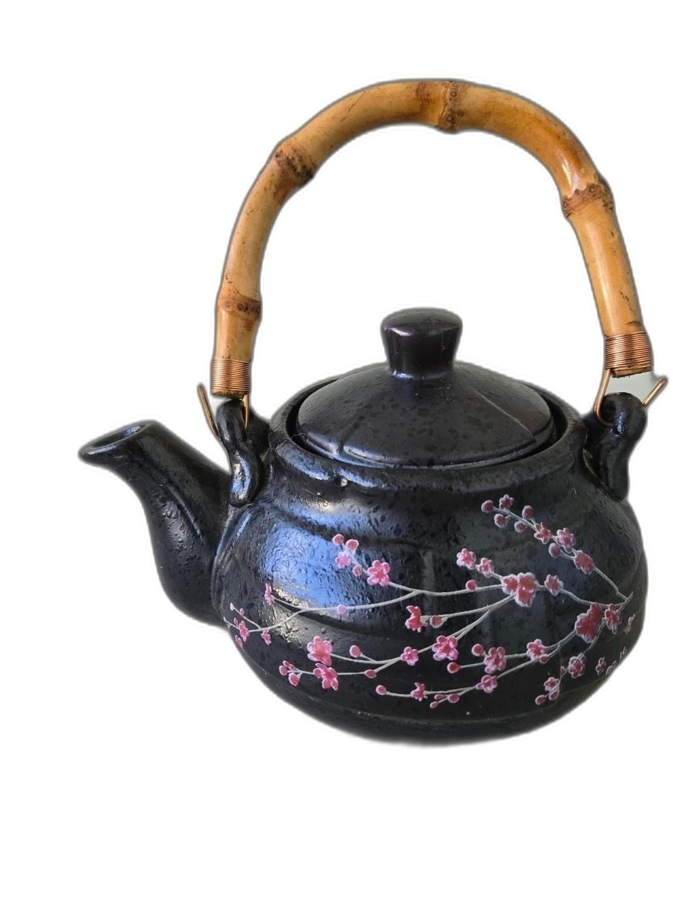 대나무 손잡이에 꽃 그림이 있는 다기 주전자 입니다.