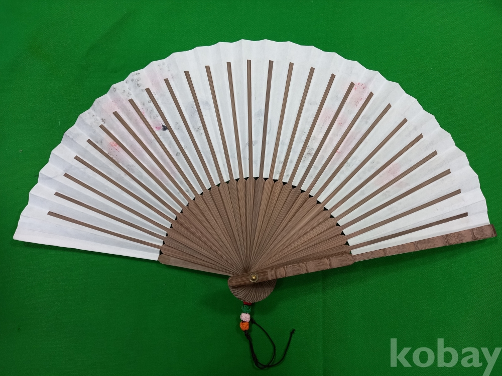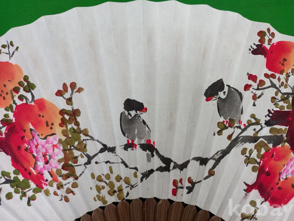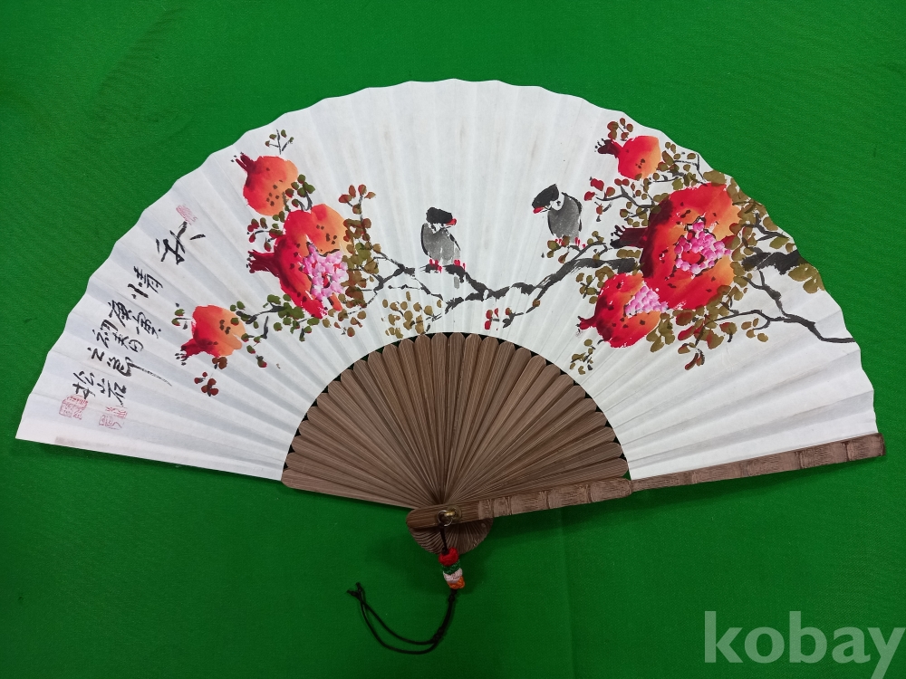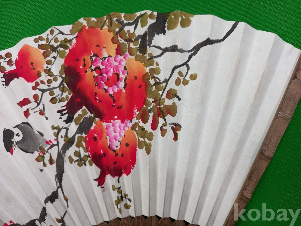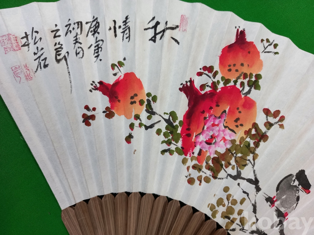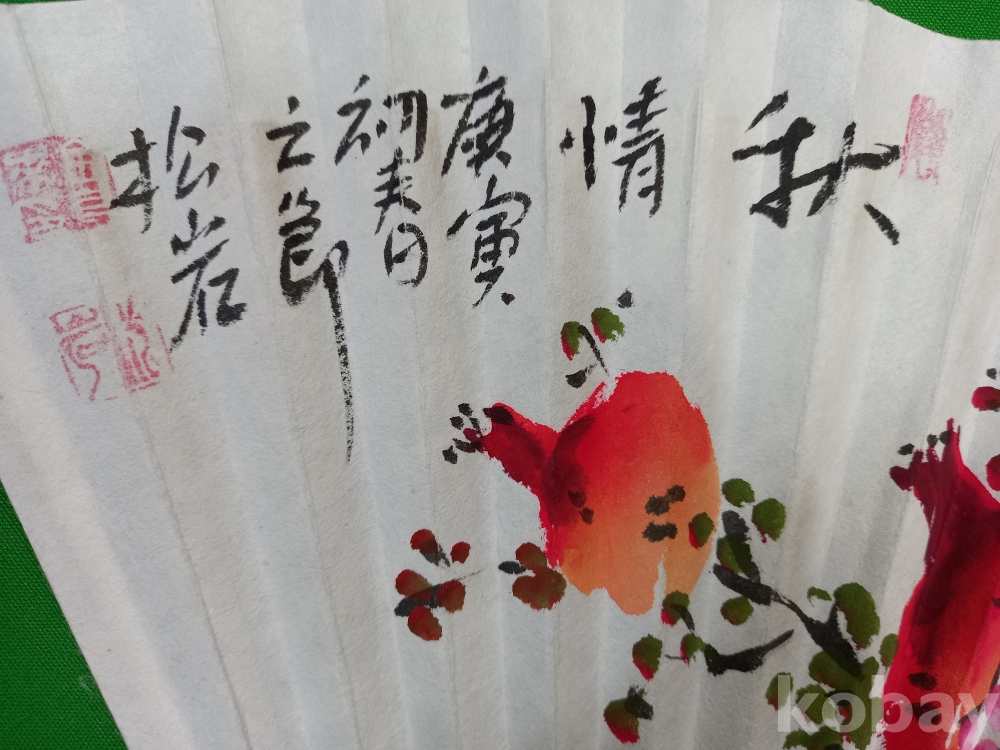 한국화가 송암(松菴) 김정환(1927~) 작가가 부채(합죽선) 위에 그린 석류 화조도입니다.